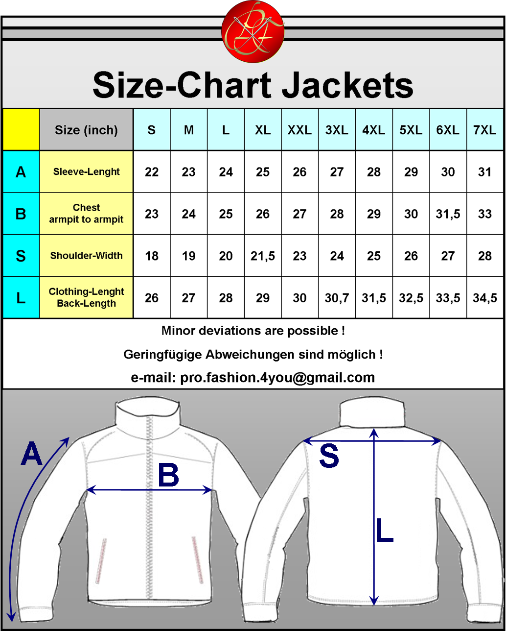 Please take one of your clothes that suits you well, measure and then compare with our size charts. Measure your jacket (clothes), not your body !
