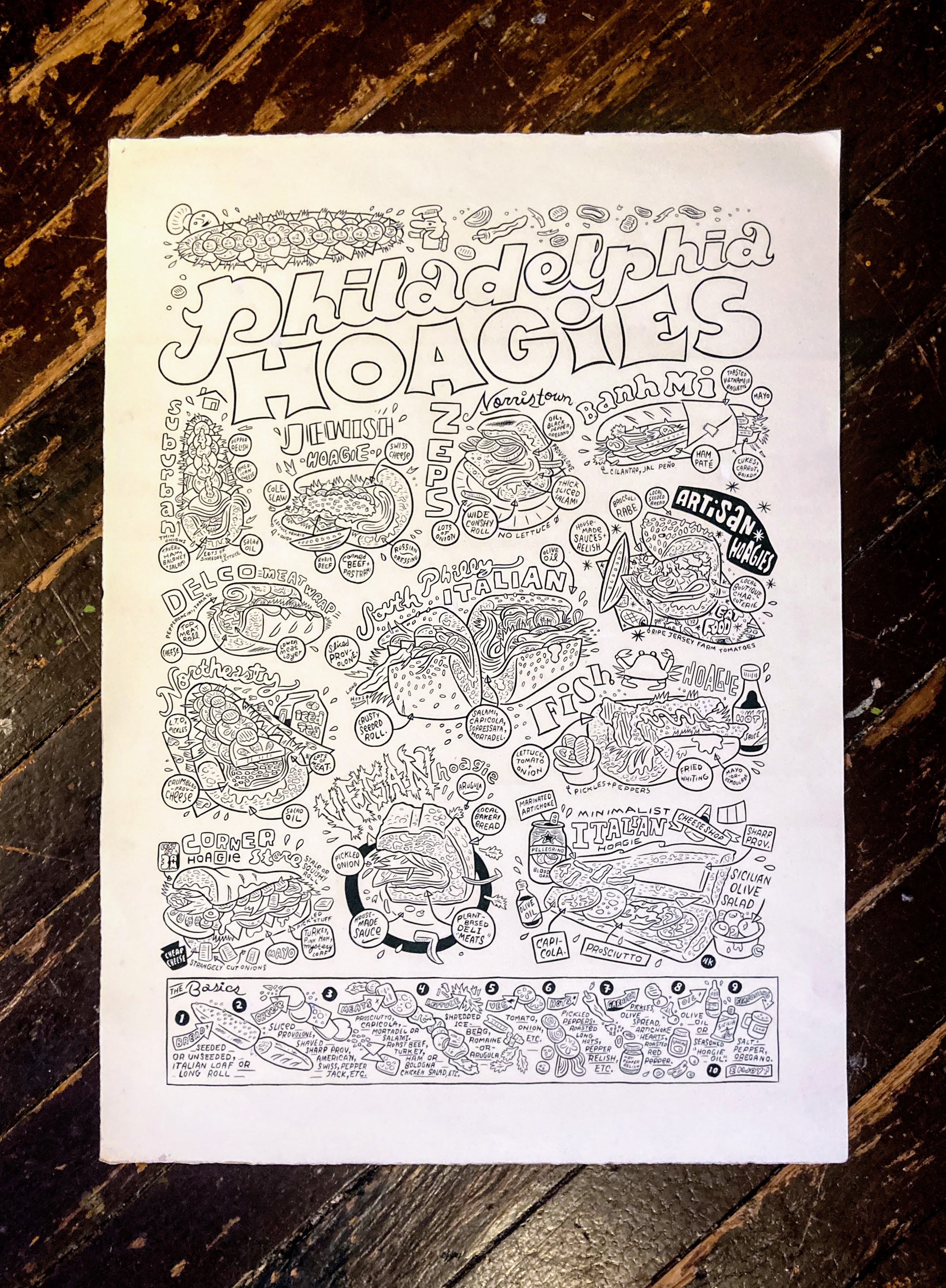 ORIGINAL ART for the Philadelphia Hoagie Poster I designed earlier this year. Guide to (my interpretation of) Philadelphia's myriad of cold Hoagie styles.