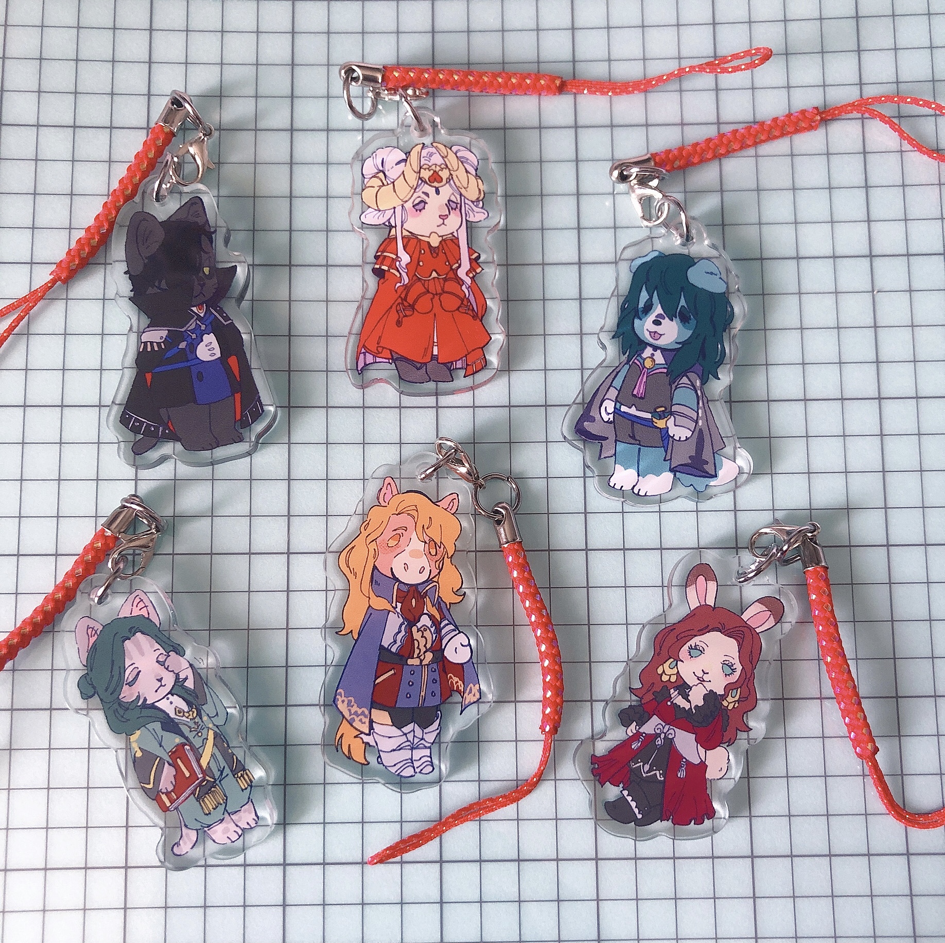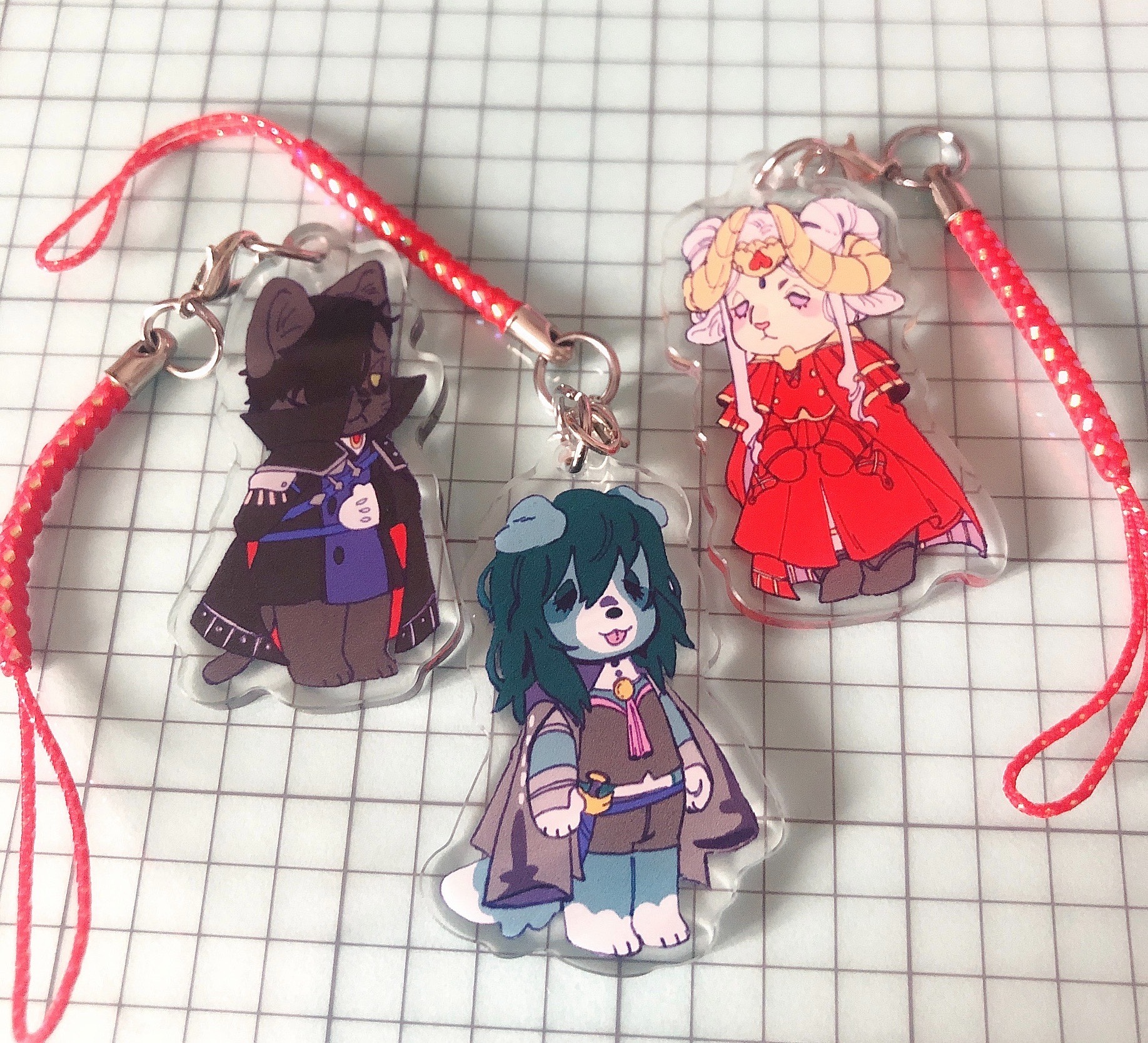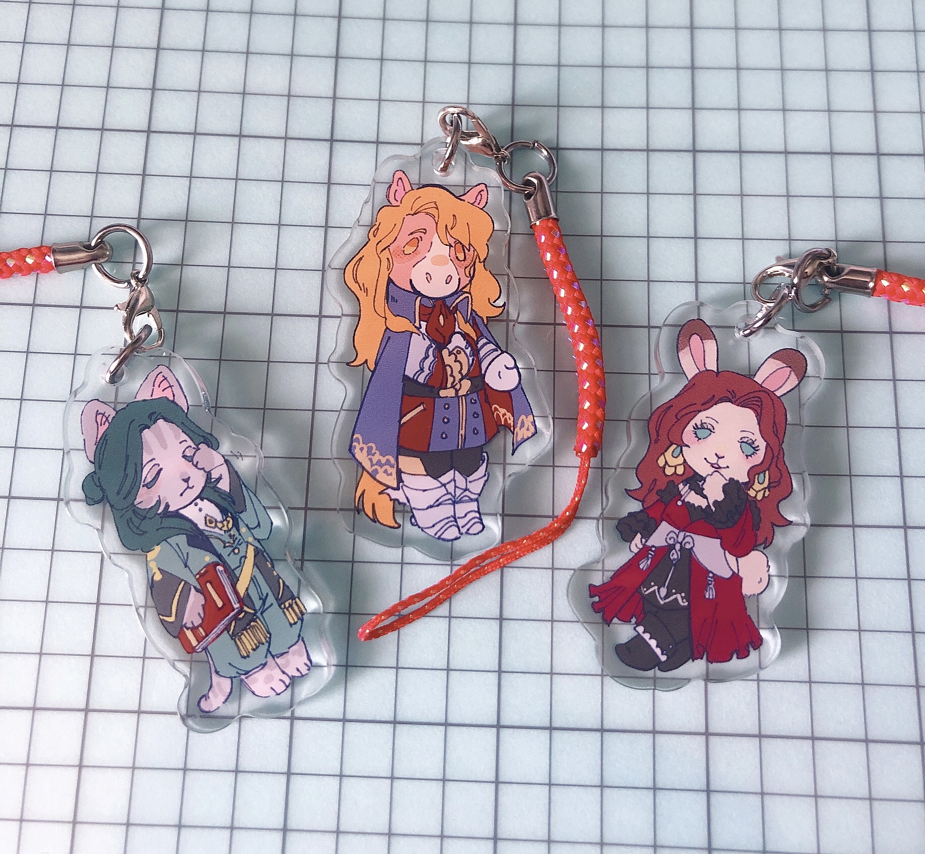 2 inch acrylic charms of Byleth, Edelgard, and Hubert in the style of Calico Critters/Sylvanian families figures..