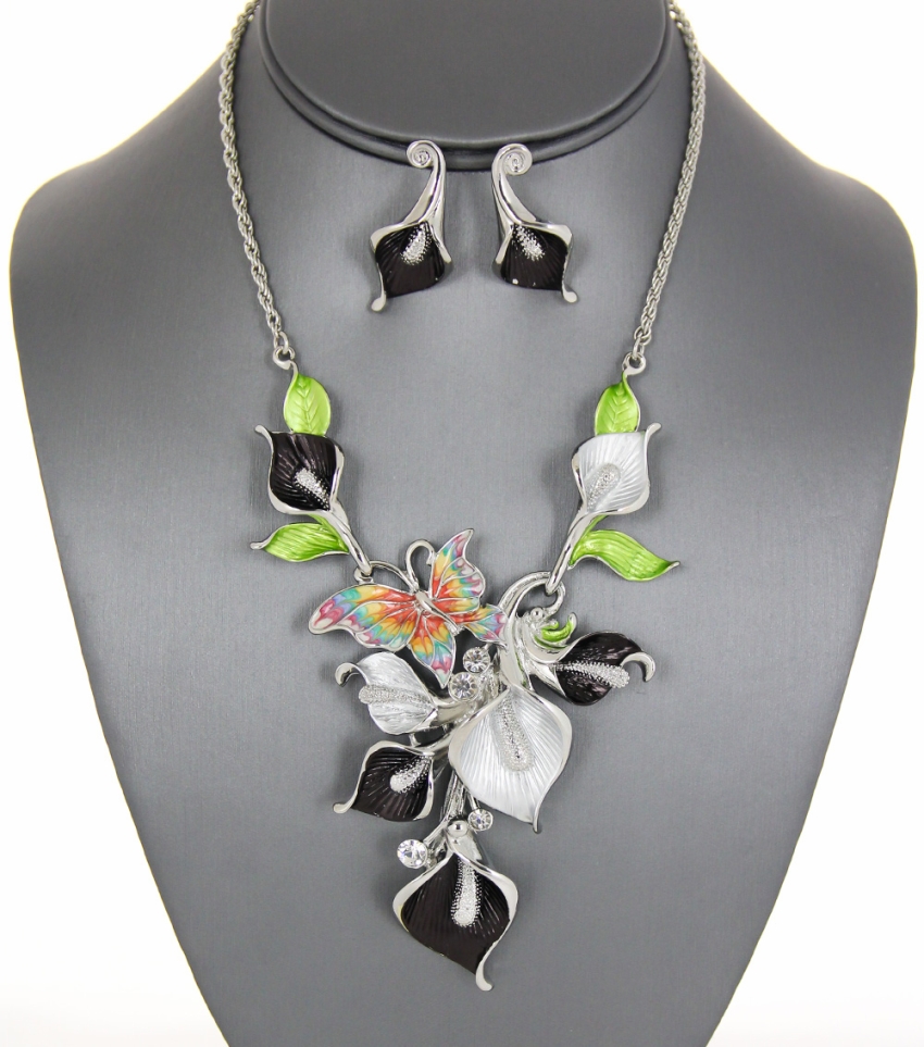 BACK IN STOCK! Calla lilies, crystals, gorgeous colors on metal and a butterfly - just a beautiful set perfect to wear anywhere - and with earrings too. Shades of greys, green and black. Very sophisticated but fun too! Necklace is 16 inches long with 3 inch extender. Center drop measures 3.5 inches long. Matching earrings are 1 3/4 inches long. STUNNING set and at such a great price!