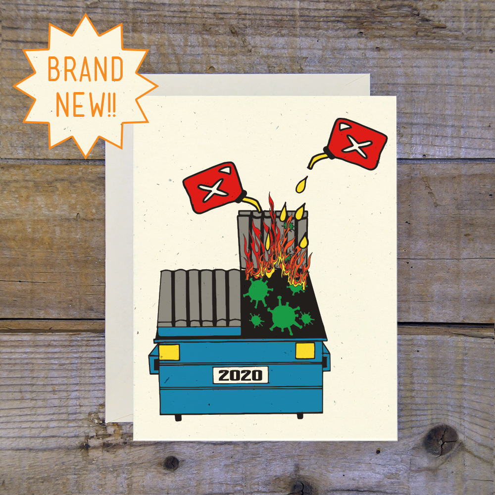 Greeting card featuring our representation of 2020. Our cards are small batch printed with eco-friendly ink on 100% recycled paper by French Paper Co. Cards are 5.5-in x 4.25-in, blank inside and come with an envelope in a protective sleeve.