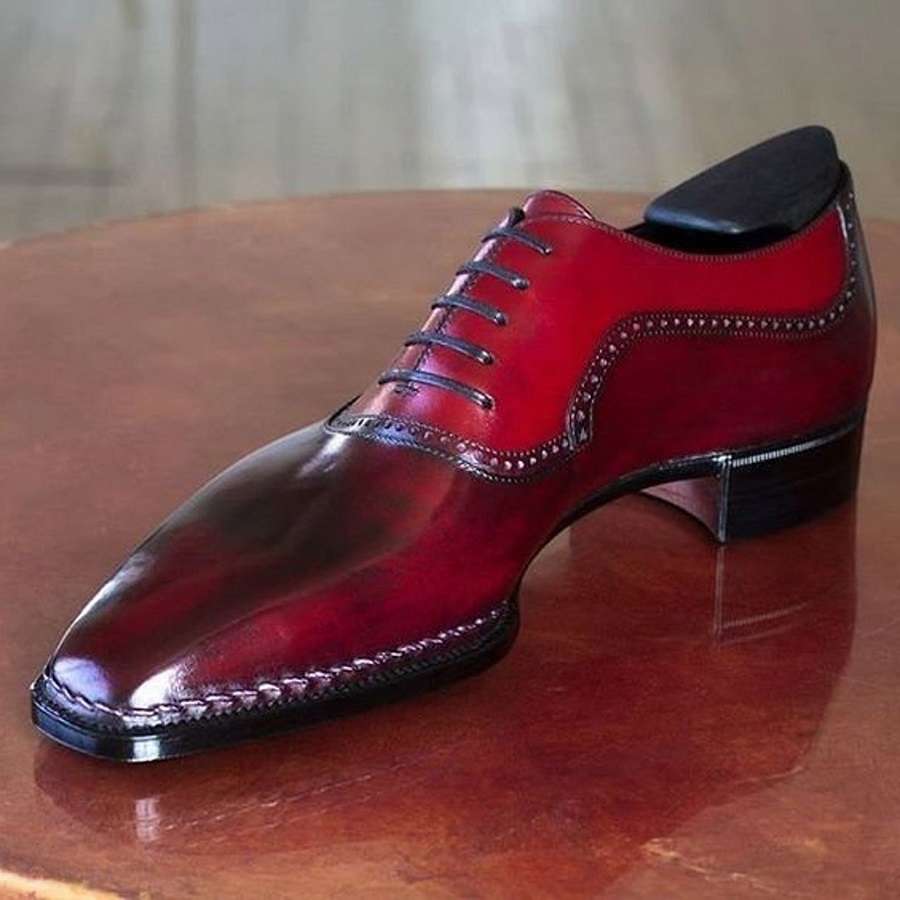 Handmade Men's Two Tone Red & Burgundy Leather Oxford Shoes Men's Lace-up Upper Stich Sole Formal Oxford Leather Shoes