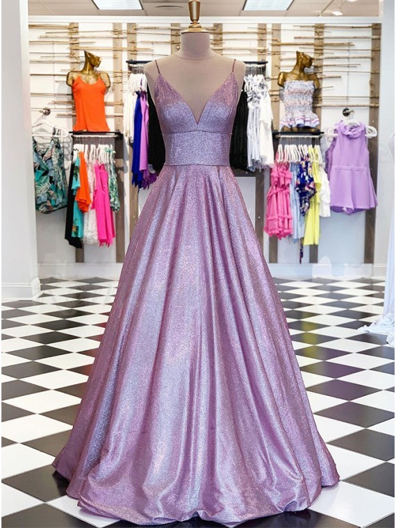 A-Line Spaghetti Straps Long Prom Dress Glitter Lilac Evening Dress,355