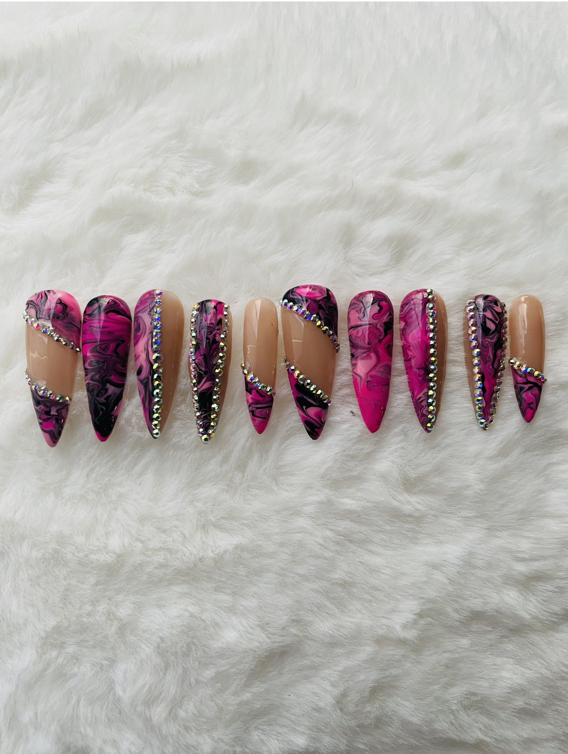 Set of 10 Nails *High quality Durable Tips. Looks like acrylics! *They will last 2-3 weeks with proper nail prep and care. All nails are made to order and hand painted by me. Due to the hand made nature of these nails, there will be slight differences between your set and those in the photos If you would a custom color. Please email to discuss. Package includes: 1 Full Size Nail File 1 Cuticle Pusher 1 Prep Pad 1 Nail Glue Don’t know your size? Check out my sizing guide chart or purchase my nail sizing kit. • DISCLAIMER • Different display monitors may slightly distort the lighting and color of the photos. When checking out please write your desire color and finish in the note section. If your nails don’t match the pre-determined sets, just select CUSTOM and leave your sizes in the note section at checkout. Example ------------- Thumb: 2 Pointer: 5 Middle: 6 Ring: 7 Pinky: 9