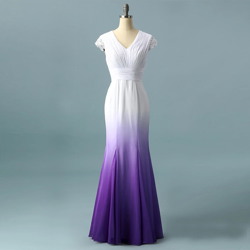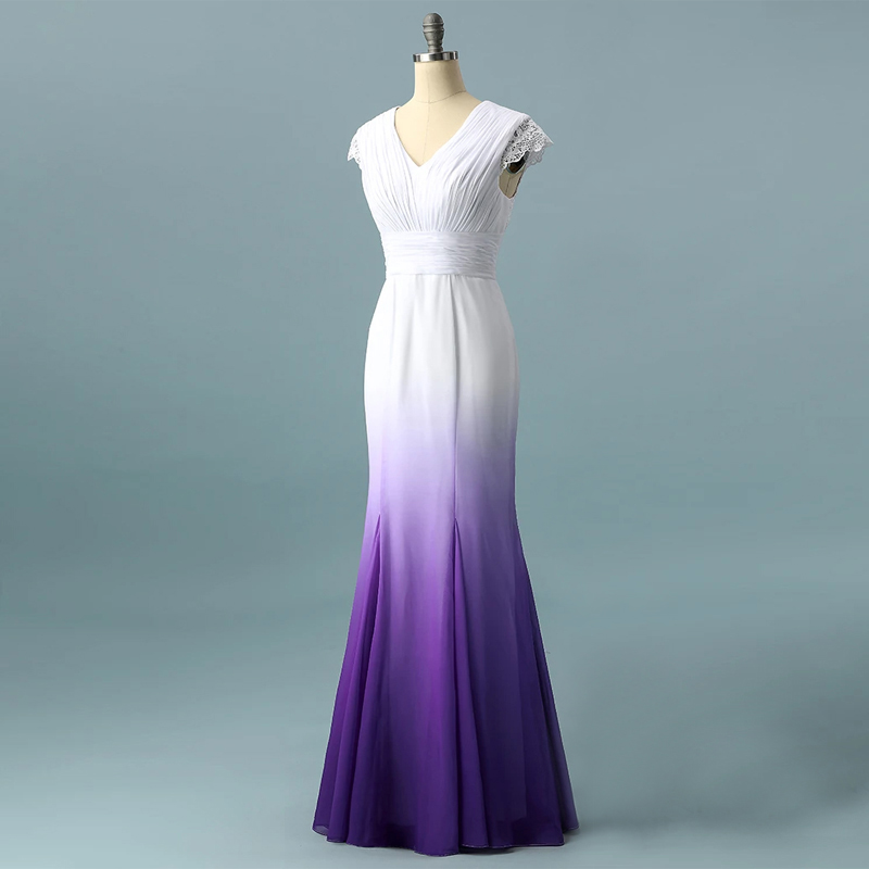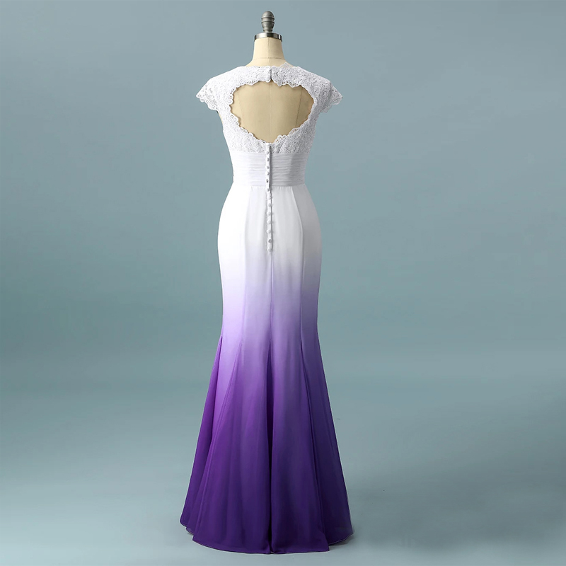 Real Photos White Purple Ombre Wedding Gowns Lace Appliques Modest Bridal Dresses Open Back Cap Sleeve Bride Dress