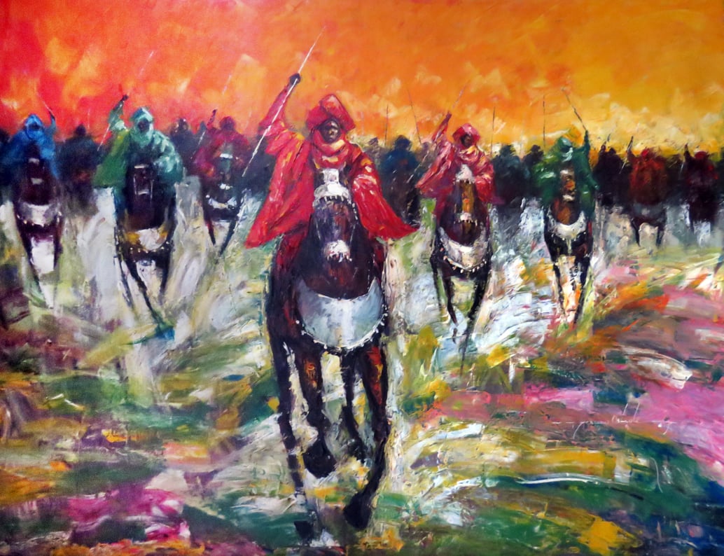 Durbar festivals are organized in almost all cities of northern Nigeria and has become a major tourist attraction. In Northern Nigeria, the practices dates back over 200 years. The festival marks the end of Ramadan and also coincides with the Muslim festivities of Eid al-Adha and Eid al-Fitri. Original acrylic on canvas oil painting 119cm by 89cm, Unframed