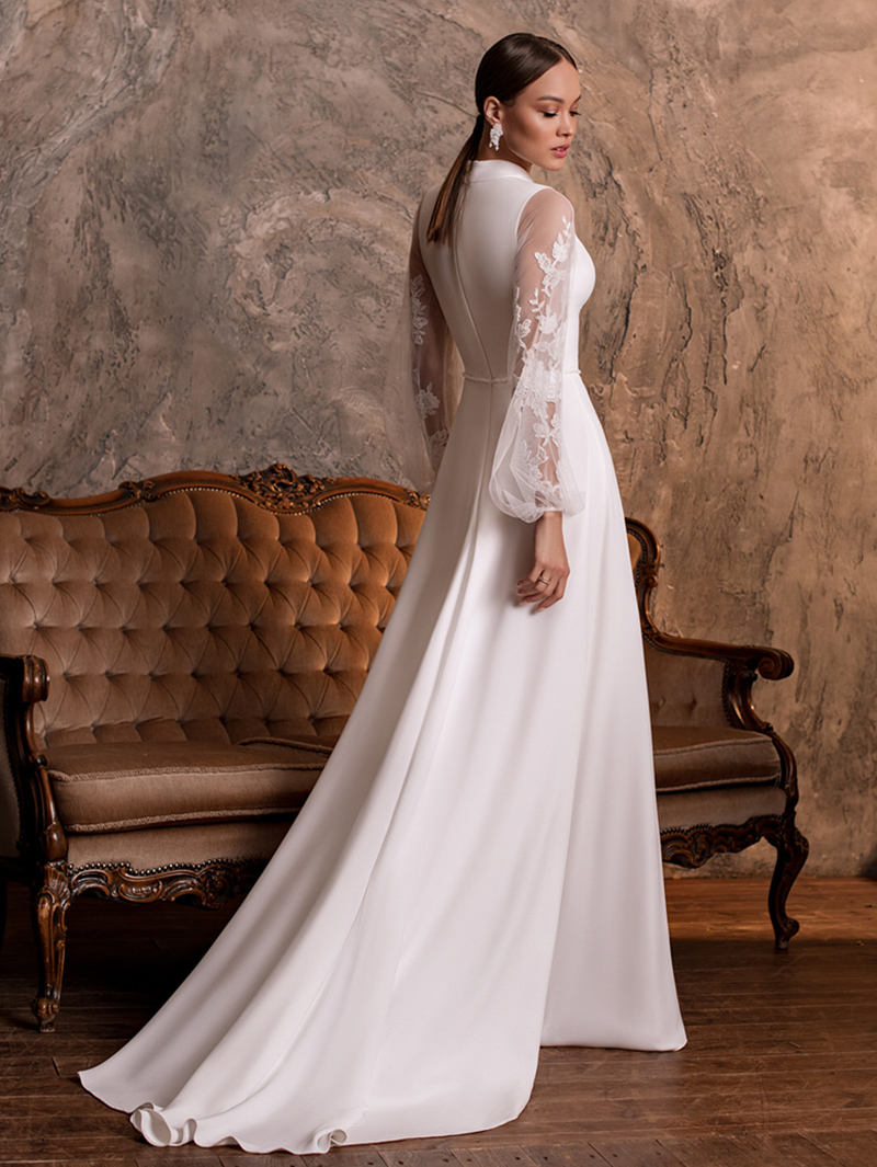 A Line High Neck Keyhole Wedding Dress Vintage Long Transparent Sleeve Lace  Bridal Gowns-3