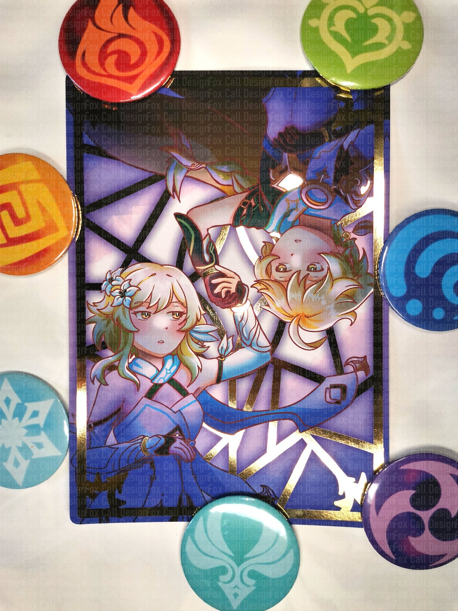 Lumine and Aether print. A5 with golden foil. Silk soft touch paper. This product agrees with the terms and conditions established by Mihoyo: https://www.hoyolab.com/genshin/article/381519