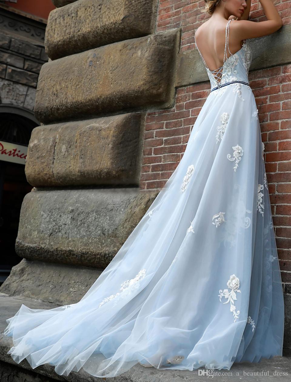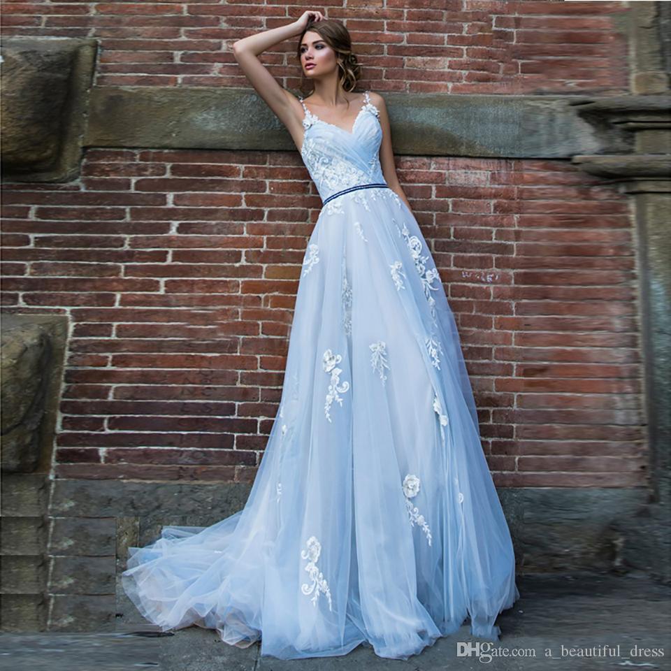 Light Blue Wedding Dresses Lace Appliques A Line V Neck Spaghetti Straps Illusion Bridal Gown