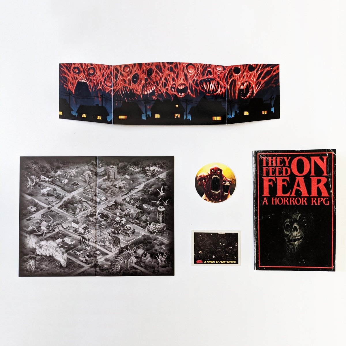 They Feed On Fear: A Horror RPG (1E) (Bundle) Includes: 1 Physical Rulebook/1 Provider Screen/1 Sticker/1 Collectible Card/1 Map/Character-Sheet/PDF version of They Feed On Fear: A Horror RPG. Please provide your email; a link to the file will be sent to that address. Link is usually provided after shipment is made.