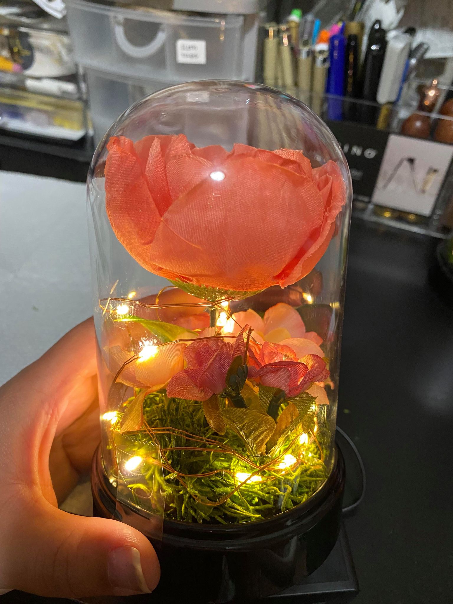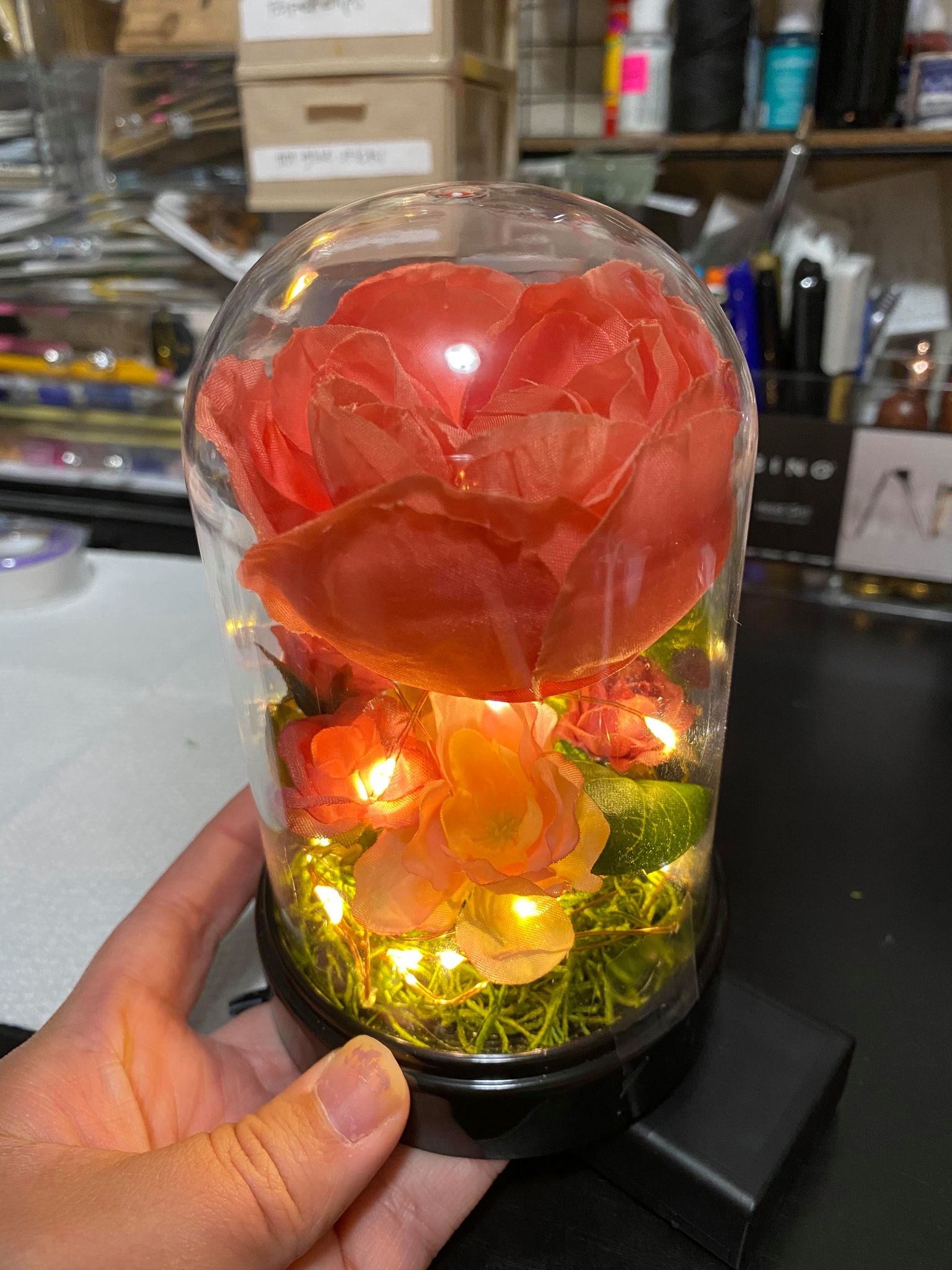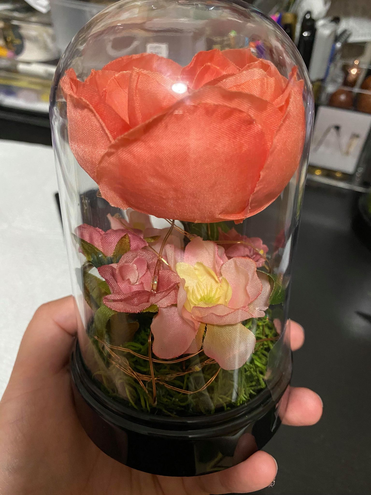 A pretty Coral themed color with hints of mauvey-pink flowers. Size is 5 inches tall, about 4 inches width. Battery operated and included, has a on, off, and timer button with instruction sheet. Perfect for adoring, perfect night light, small and lovely. These are plastic so it's shatter proof if they fall!