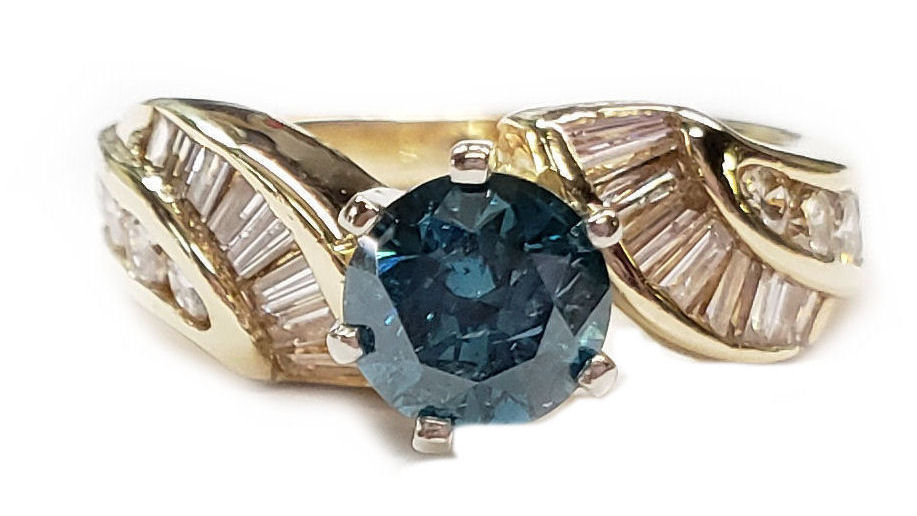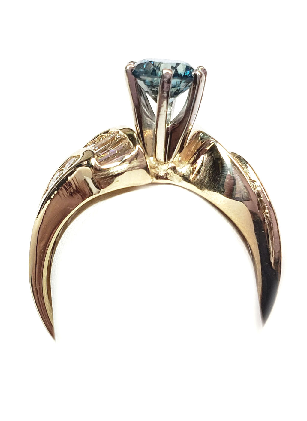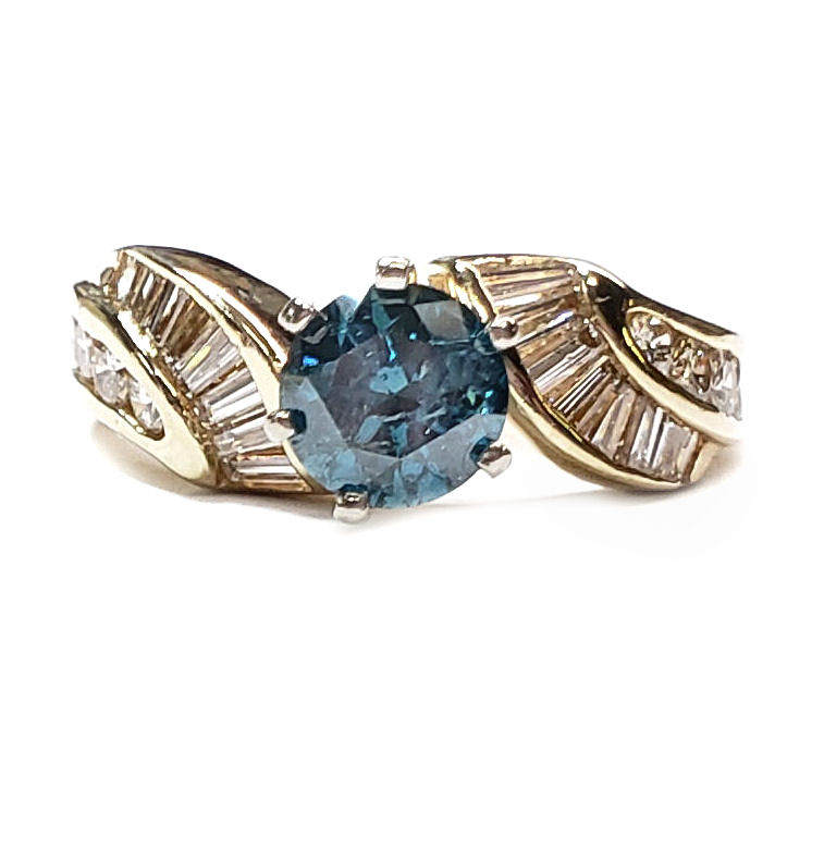 14kt. yellow gold diamond baguette and round engagement ring. There is a row of rounds and a row of baguettes channel set on each side of the center stone, there are 17=53pts. of baguettes, and 10=55pts. of round diamonds, that are H-I color and SI1 clarity. There is a total of 1.08cts. of diamonds in the ring, and it weighs 2.6dwt. and is a size 6 3/4. The center stone is a 90pt. Round brilliant cut that has been irradiated blue. It is an SI2 clarity, and is set in a 6 prong setting. This is a very unique engagement ring, people love our blue diamonds. They are 100% natural diamonds.