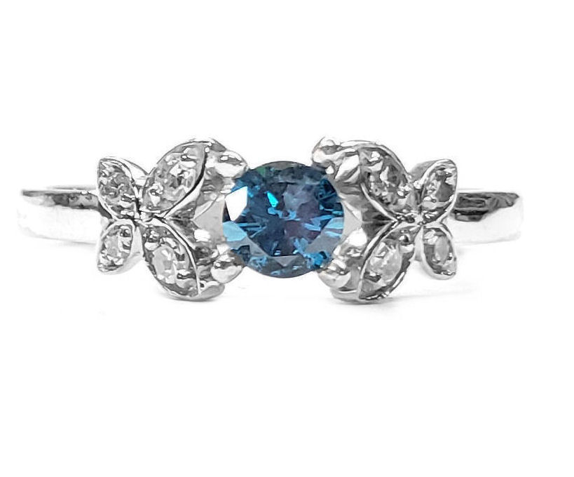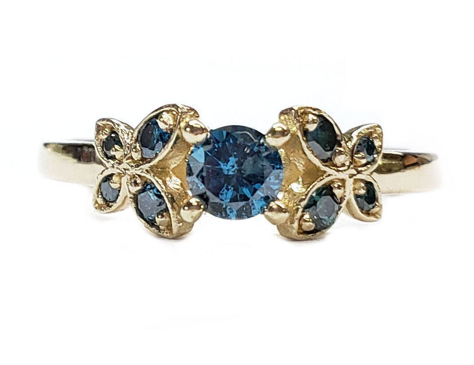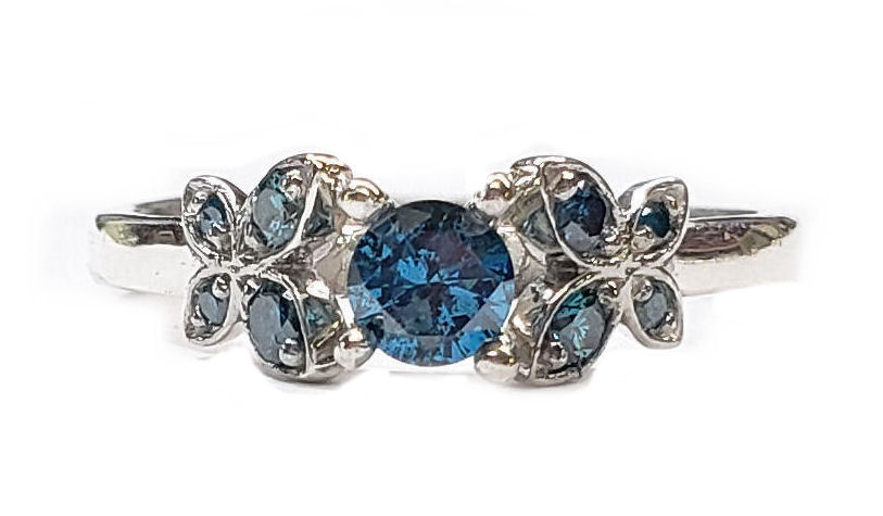 This is our newest piece of jewelry, everyone loves butterflies, now you can have them in your engagement ring. The butterflies each have 4 diamonds that are blue VS quality and weigh a total of 20pts.. The center stone is a 1/4ct. natural round diamond irradiated blue in the center. that is an SI1 clarity All of the blue diamonds have been irradiated that color. You can order this ring in either white or yellow gold. The ring comes in finger sizes 5-8 1/2