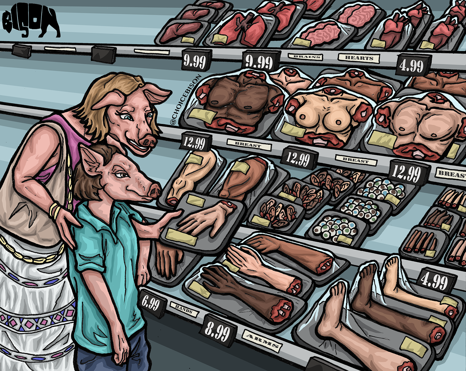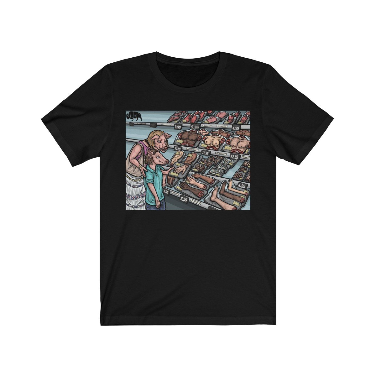 "CRUEL FOODS" by CHOICE BISON digitally printed on a t-shirt will be sure to turn heads, catch eyes and open minds! The viral artwork carries a message to promote animal, human, and environmental well being that you will be proud to represent.