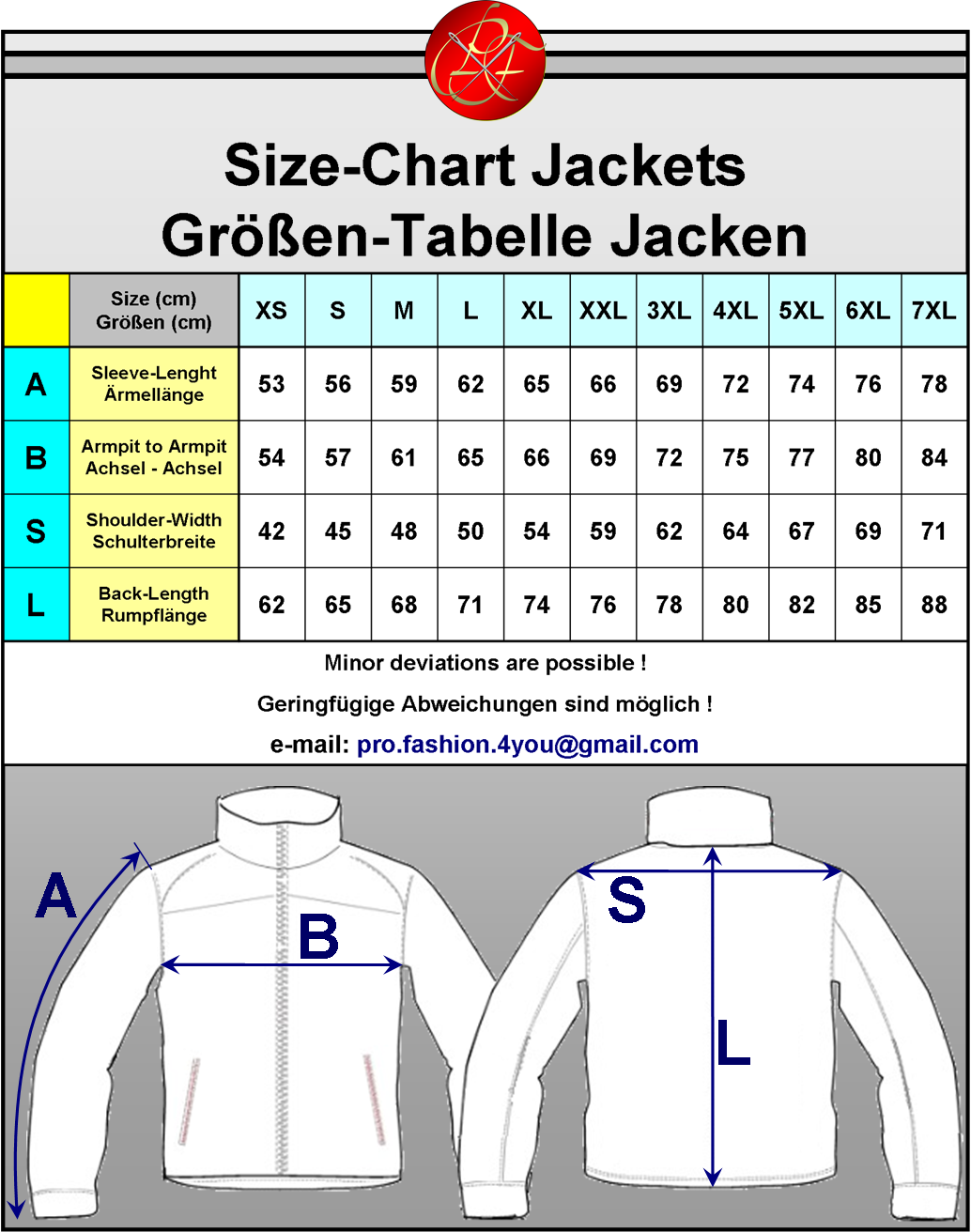 Please take one of your clothes that suits you well, measure and then compare with our size charts. Measure your jacket (clothes), not your body !