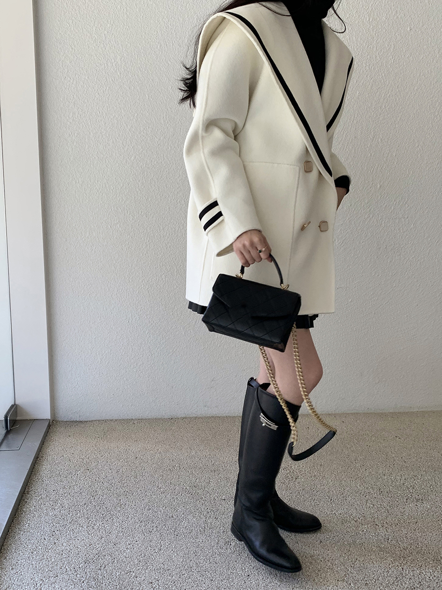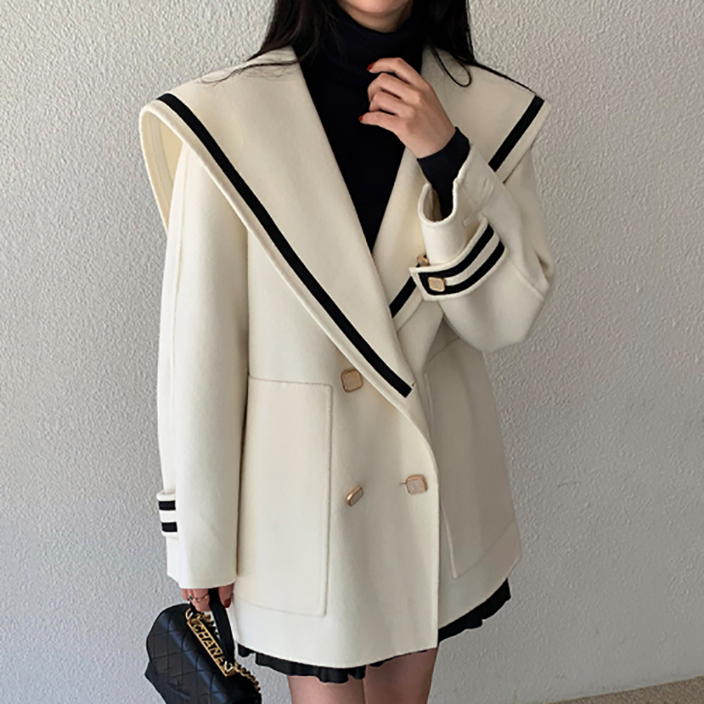 Women Contrast Sailor Collar Woolen Coat Women Double Breasted Coat Loose Big Pockets Woolen Jacket #1005-1