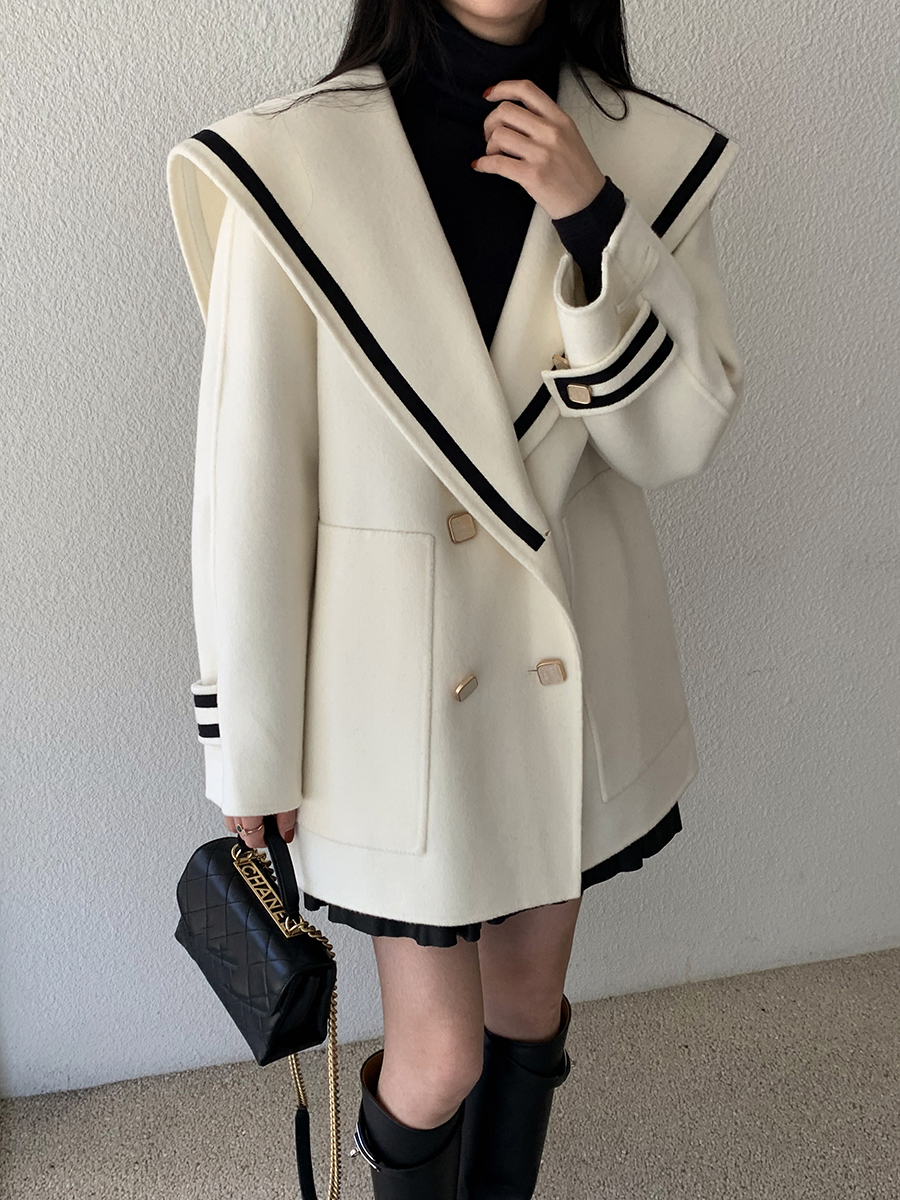 Women Contrast Sailor Collar Woolen Coat Women Double Breasted Coat Loose Big Pockets Woolen Jacket #1005-2