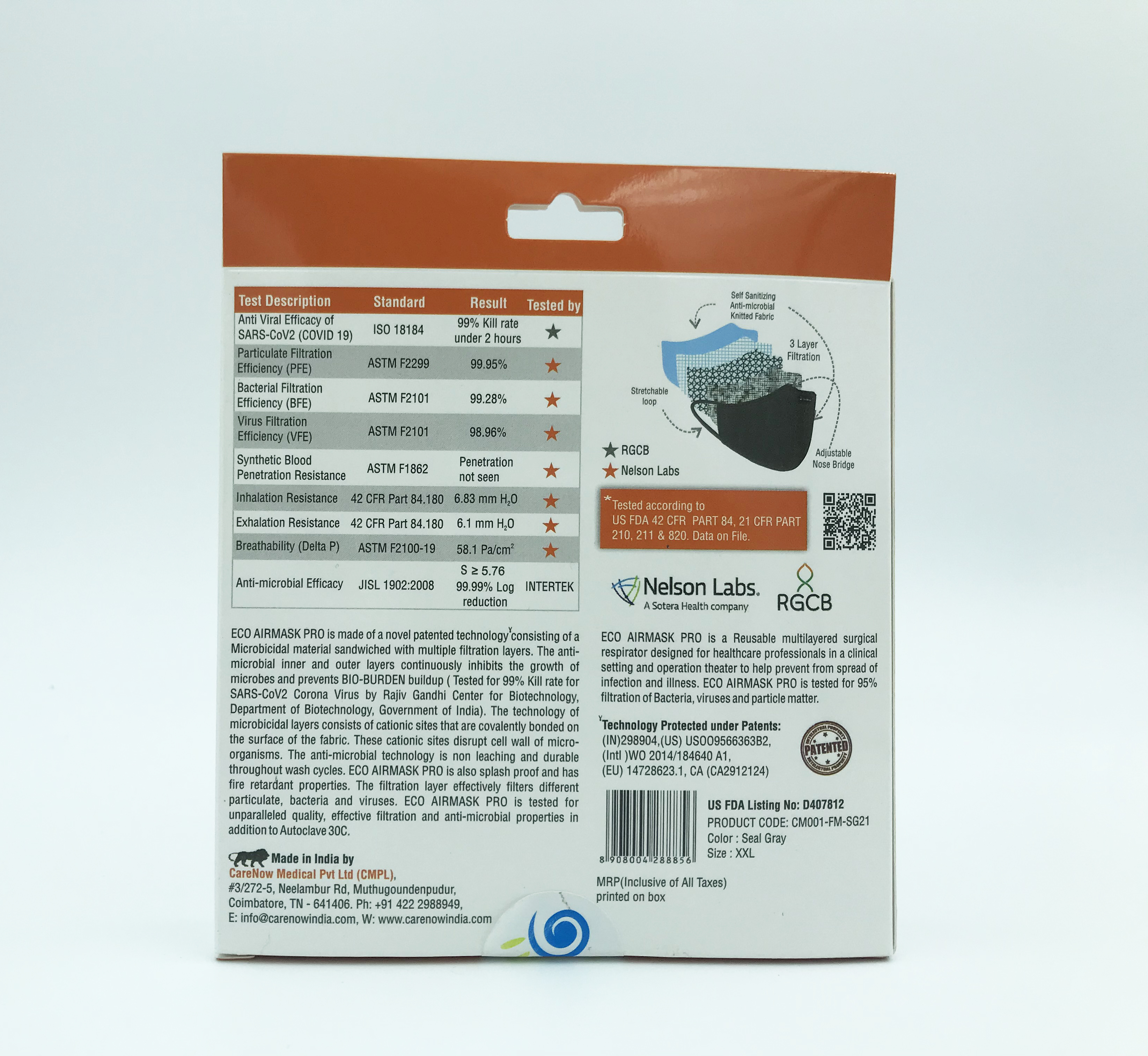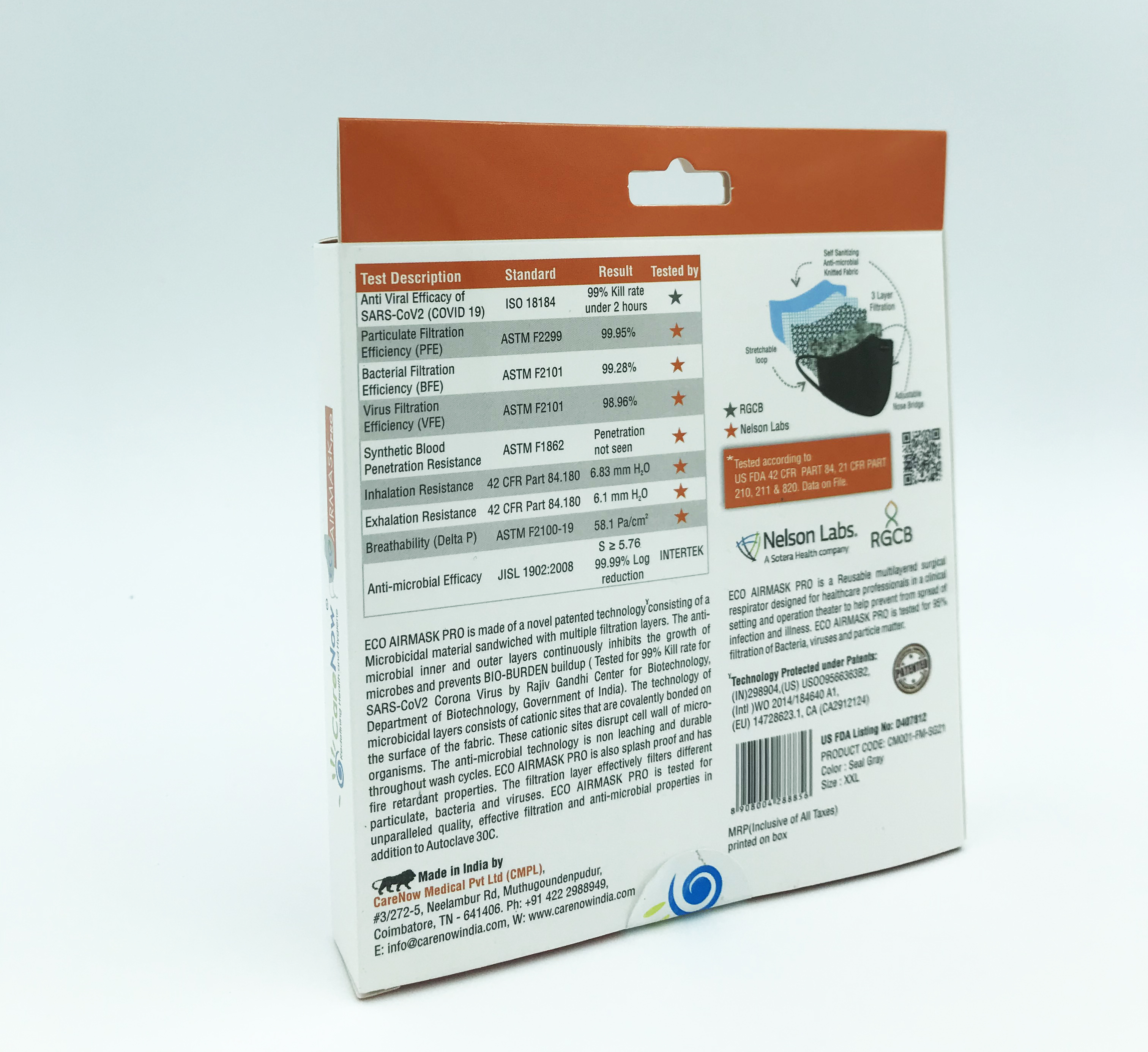 SARS-Cov2 Virus which is responsible for COVID-19 has a size of 150nm. ECO Airmask Pro has been tested for 60nm viruses (Bacteriophages at 99.9% filtration. Designed with a unique antimicrobial technology that provides a barrier of protection that is highly effective and everlasting throughout the life of the fabric. ECO Airmask Pro comes with a mechanism that provided continuous defense achieving anti-microbial activity and does not deplete over washes.