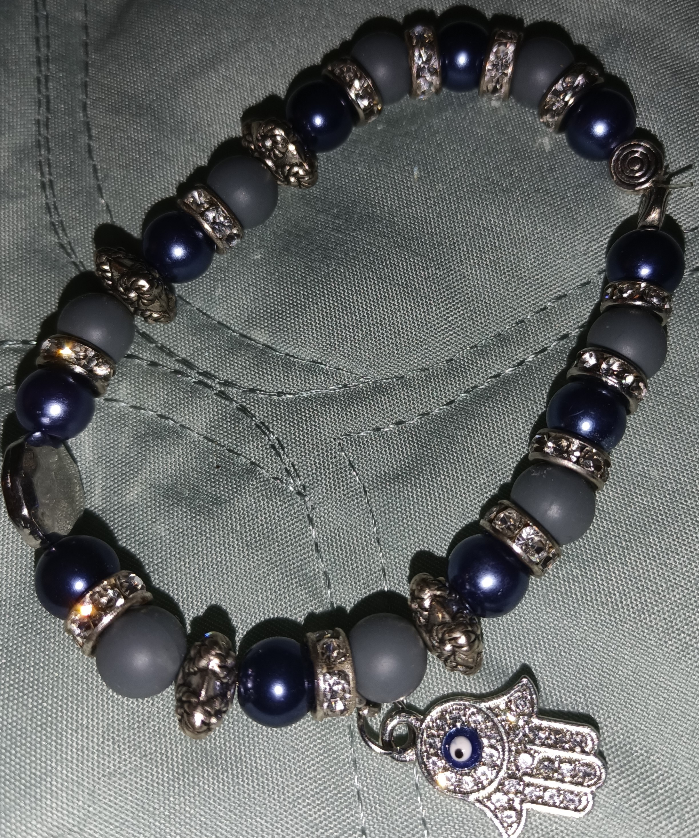 Stretch bracelet made with blue glass beads with silver , matte blue beads with silver accent spacer beads and evil eye charm[ repels negative energy]