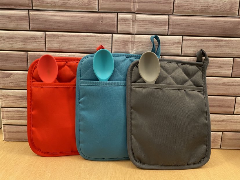 9x7 rubber backed turquoise polyester pocketed oven mitts Vinyl Image Kit option also includes: Betty Crocker Chocolate Chip Cookie Mix Turquoise silicone spoon that works like a spatula when baking.