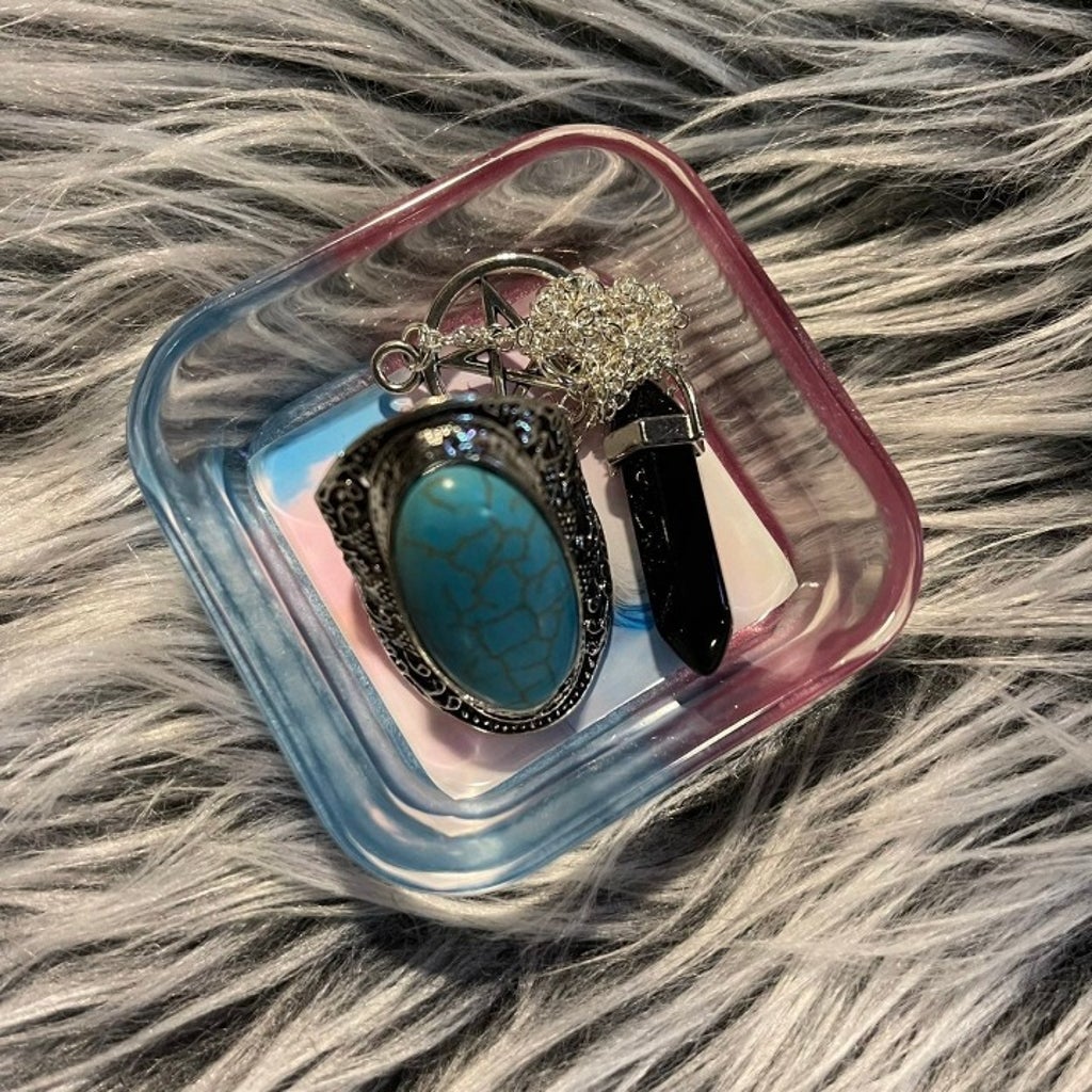 The perfect little tray that will collect all your little valuables! Makes a great gift! Crystal clear with a light pink and baby blue base. Measures 3” from corner to corner. Listing is for one mini tray. Jewelry not included. These items can be found in my other listings!