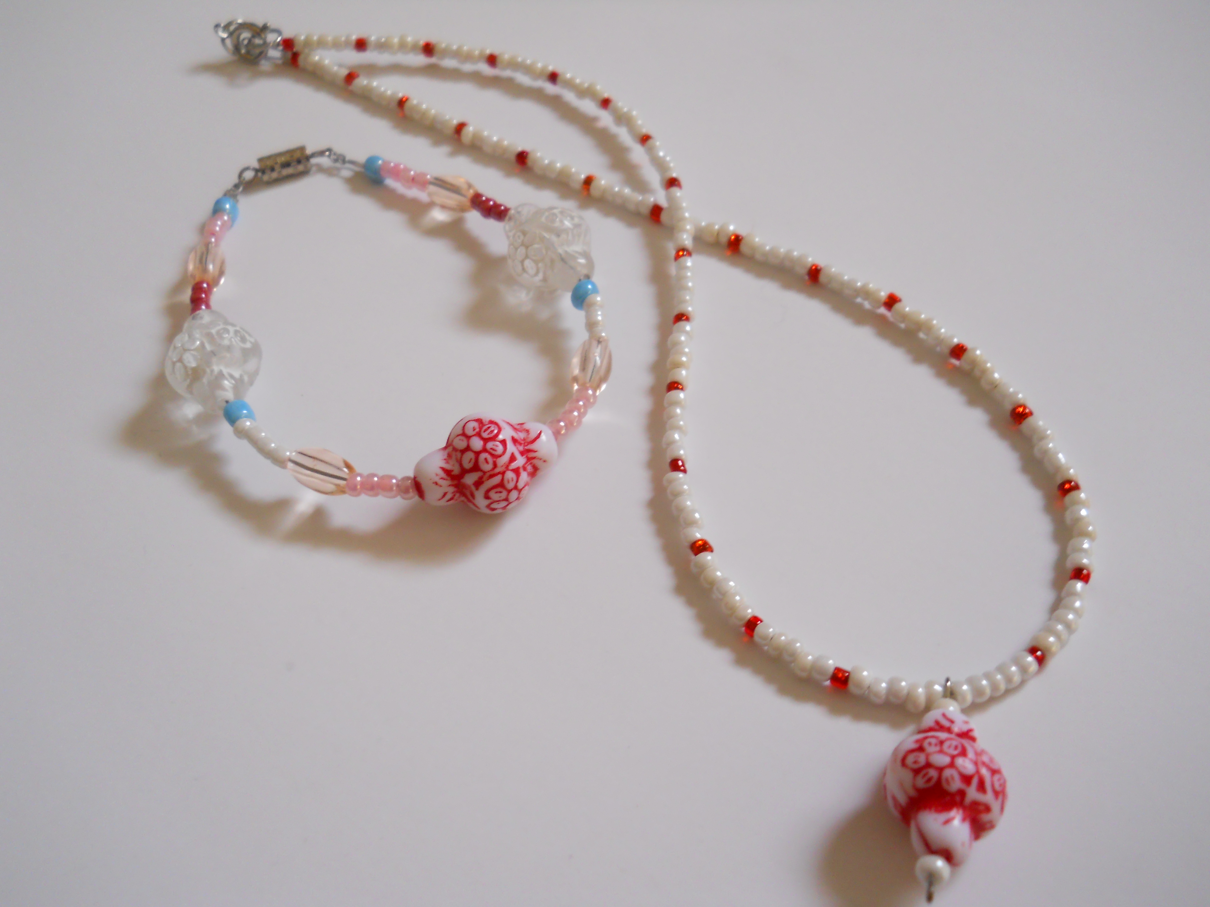 A great addition for your spring or summer collection, this necklace and bracelet set are all handmade with Red and White Seed Beads, and is centered with an appealing Acrylic Flower Bead! Connected with a Spring Ring Clasp Necklace Size - 16" Bracelet Size - 8"