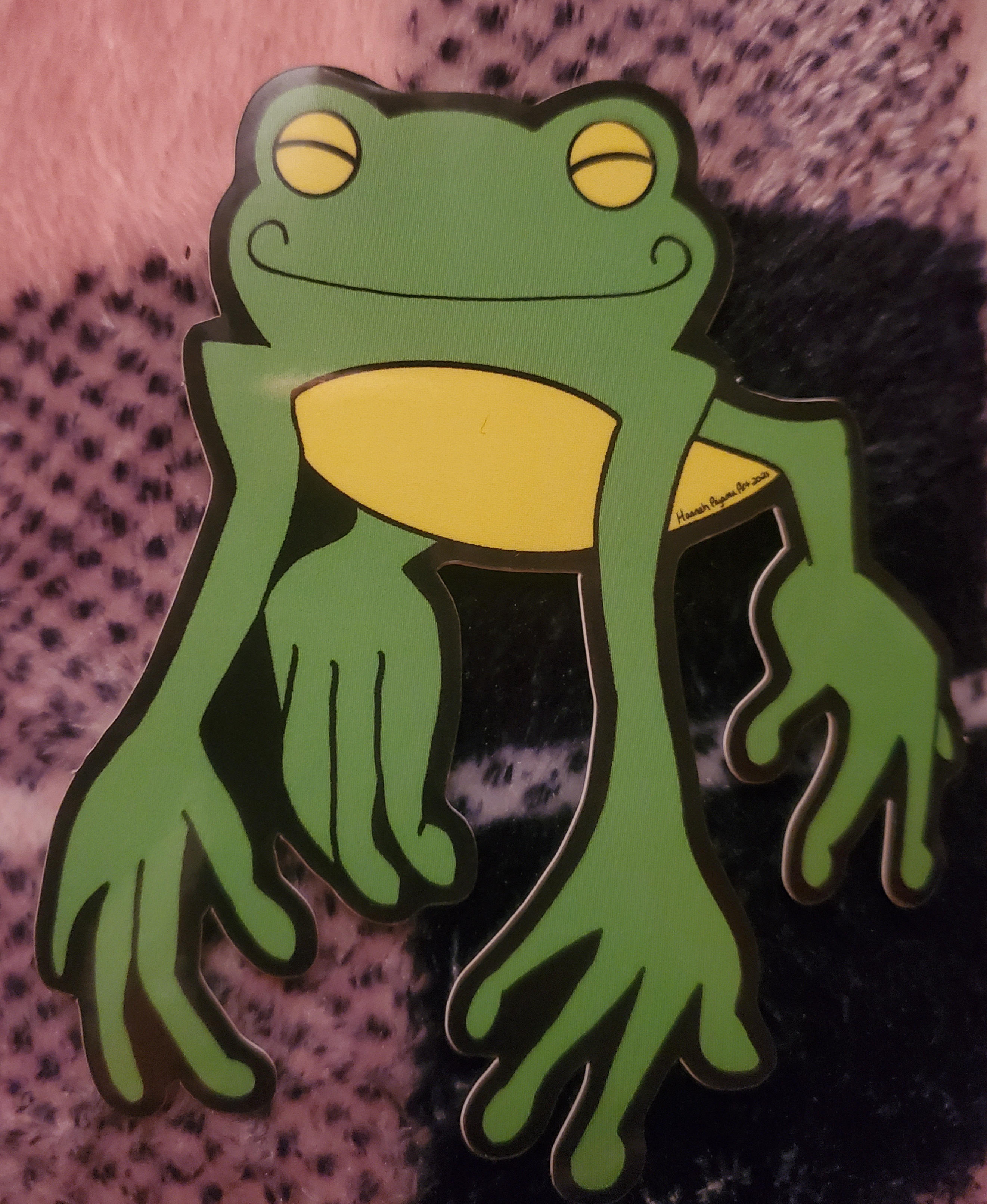This green frog sticker is 3x3.5 inches and is super chill. He is scratch proof and weatherproof, so he's great for most surfaces like cars, laptops, fridges, etc.