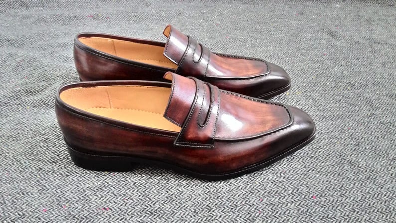 MEN'S HANDMADE LEATHER LOAFERS š—Øš—½š—½š—²š—æ: Genuine Calf Leather š—œš—»š—»š—²š—æ: Genuine Leather š—¦š—¼š—¹š—²: Genuine Leather. (Options available: Rubber, Vibram, Crepe) š—›š—²š—²š—¹: Genuine Leather š—–š—¢š—Ÿš—¢š—„: Brown (Hand Painted Patina Leather) Same As Image Available In Any Color Of Your Choice. Feel Free To Message Us For Custom Color Orders. š—§š—¼š˜š—®š—¹š—¹š˜† š—›š—®š—»š—± š˜€š˜š—¶š˜š—°š—µš—²š—±