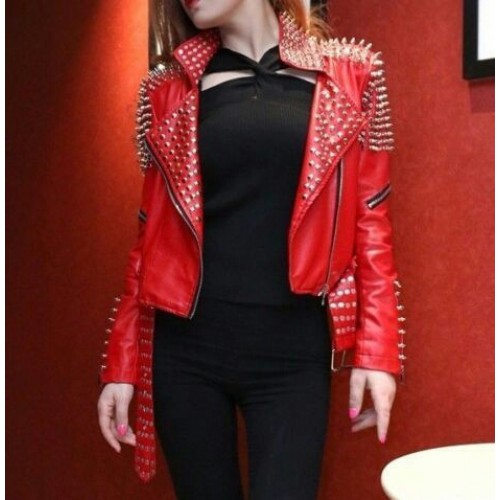 Handmade Women Red Studded Motorcycle Jacket, Rock Style Studded Jacket