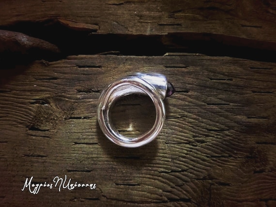This ring is a horn of plenty awesomeness, hence it's name "Amethyst Horn Of Plenty" Ring. Elegant and fluidly designed, this ring is fashioned into an edgy coil, which begins with a flute like horn and wraps it's way sensually around the finger to a thin whip like tail added to this is a 7mm African amethyst weighing in at 1.6 cts. This statement ring won't go unnoticed