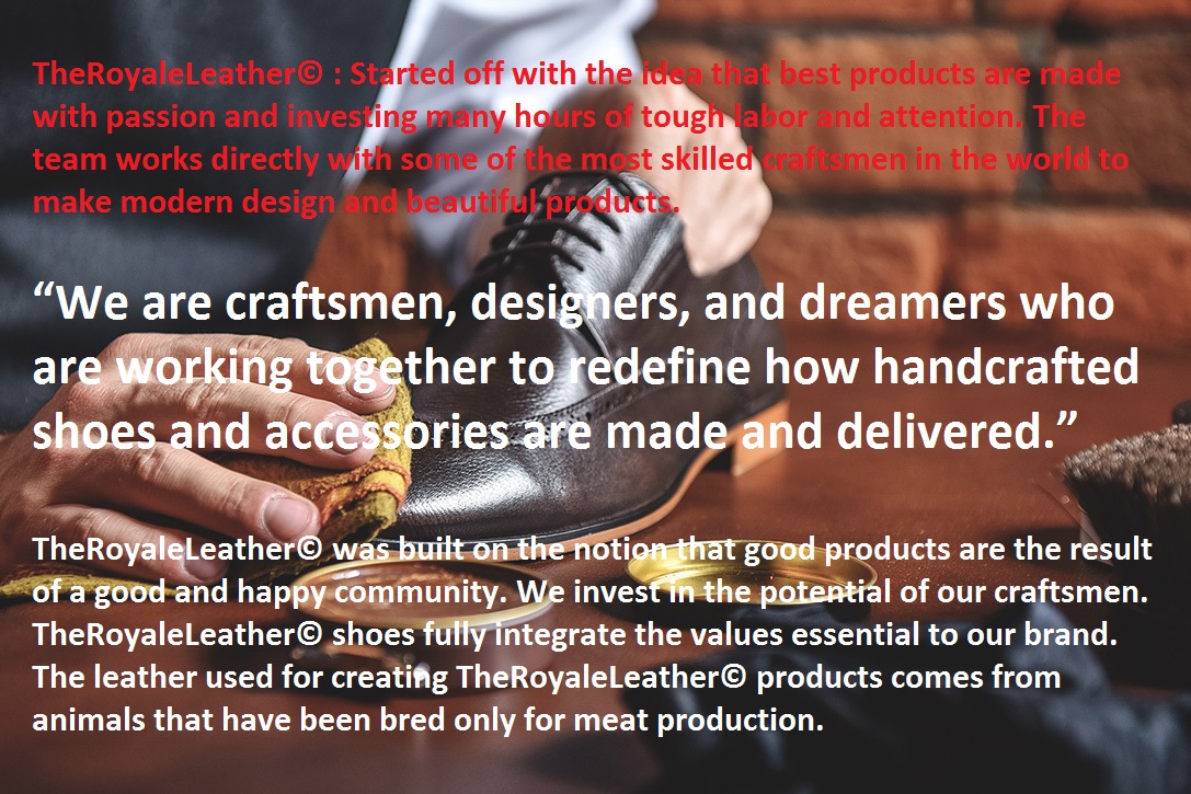 Welcome to TheRoyaleLeatherยฉ online store. A reputed name in handmade leather production of shoes, boots, Jackets & Belts accessories . TheRoyaleLeatherยฉ has proven itself by providing quality products and excellent customer service. TheRoyaleLeatherยฉ specializes in handmade Leather shoes, boots, Jackets & Belts. Custom order service and ready to wear collection of premium quality leather products are specialty of TheRoyaleLeatherยฉ . We have team of highly skillful craftsmen who crafts these products using old artisan techniques. Shoe making takes days of human work of obsessive attention to quality and finish. All our shoes are totally hand lasted, a painstaking process that only few and exclusive shoe makers now use. The immense human engagement in producing these products make each and every product at TheRoyaleLeatherยฉ unique with enduring value. At TheRoyaleLeatherยฉ each product has a story to tell so go ahead and enjoy as product speaks something about the hands making it.