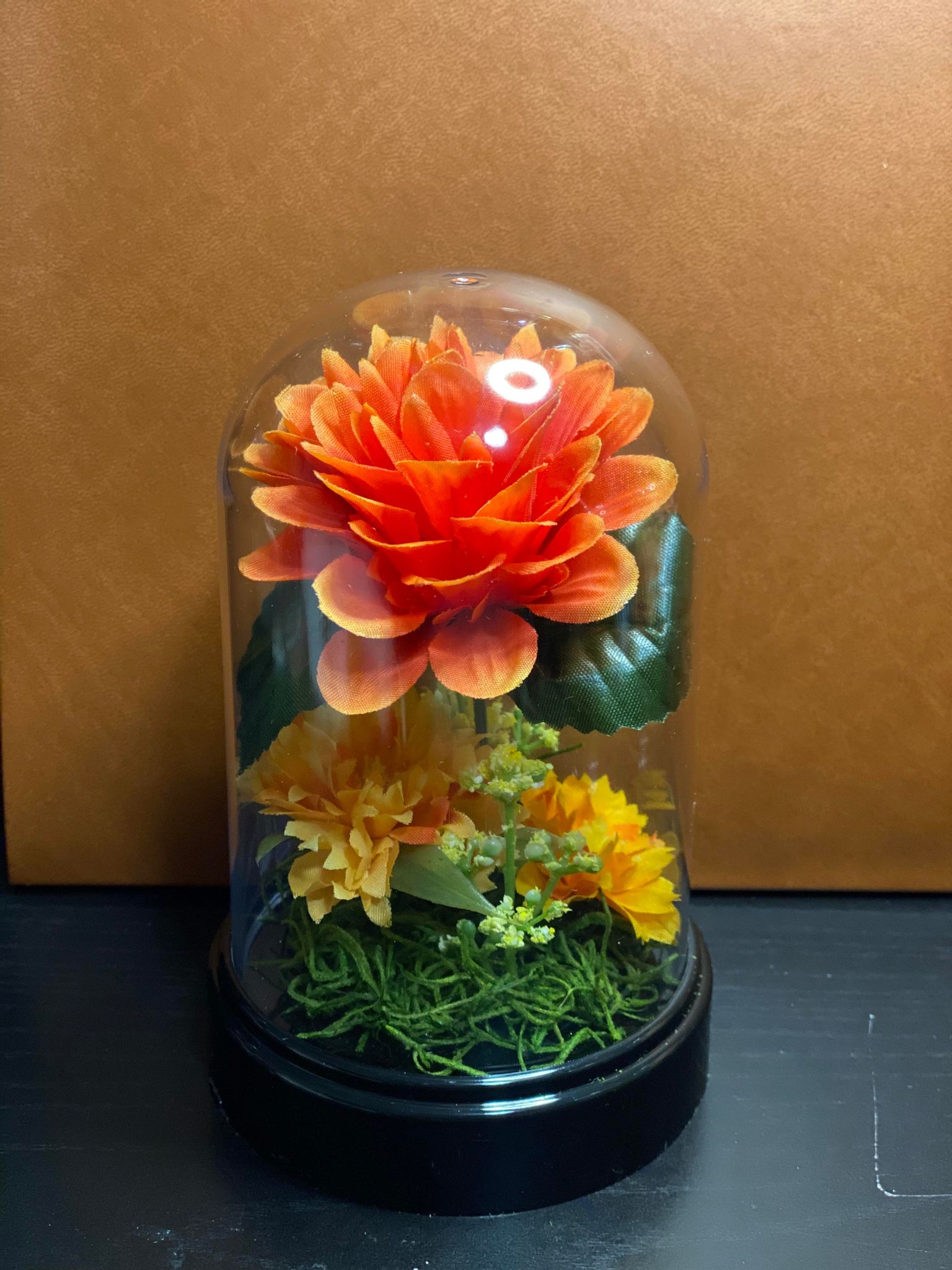 Beautiful shades of Orange and yellow floral vase. This piece reminds me of the sun the most with the different sun-like colors. The center and biggest flower reminds me of the sunset when the Sun shines orange/red colors. ***No Fairy Lights*** **THIS ITEM WILL NOT BE SOLD INTERNATIONALLY!**