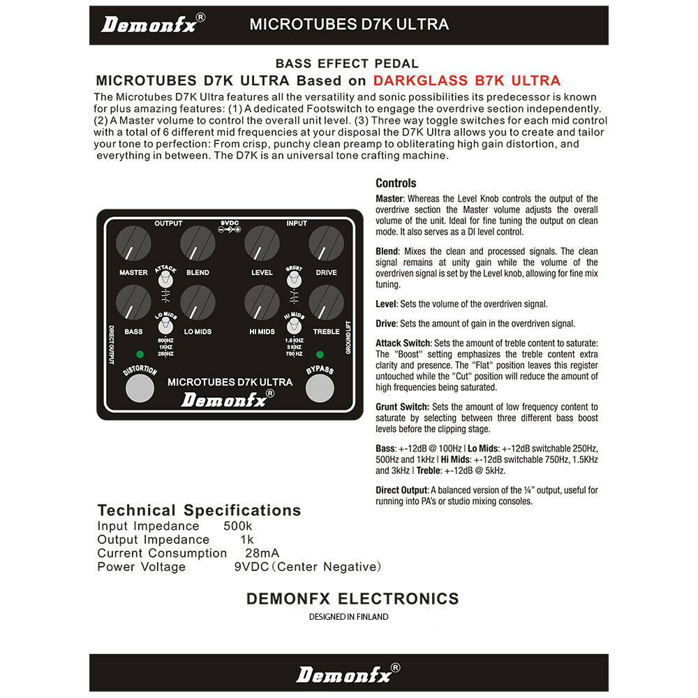 MICROTUBES D7K ULTRA Based on DARKGLASS B7K ULTRA The Microtubes D7K Ultra features all the versatility and sonic possibilities its predecessor is known for plus amazing features: (1) A dedicated Footswitch to engage the overdrive section independently. (2) A Master volume to control the overall unit level. (3) Three way toggle switches for each mid control, with a total of 6 different mid frequencies at your disposal the D7K Ultra allows you to create and tailor your tone to perfection: From crisp, punchy clean preamp to obliterating high gain distortion, and everything in between. The D7K is an universal tone crafting machine.
