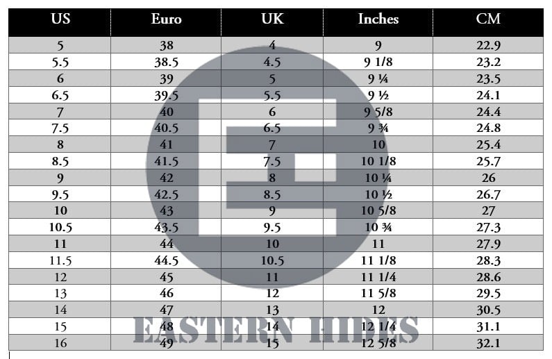 Eastern Hides size is according to foot length . please choose size according to foot length . 99% buyers choose right size by measuring the foot length . Let's choose the correct size according to the four steps below