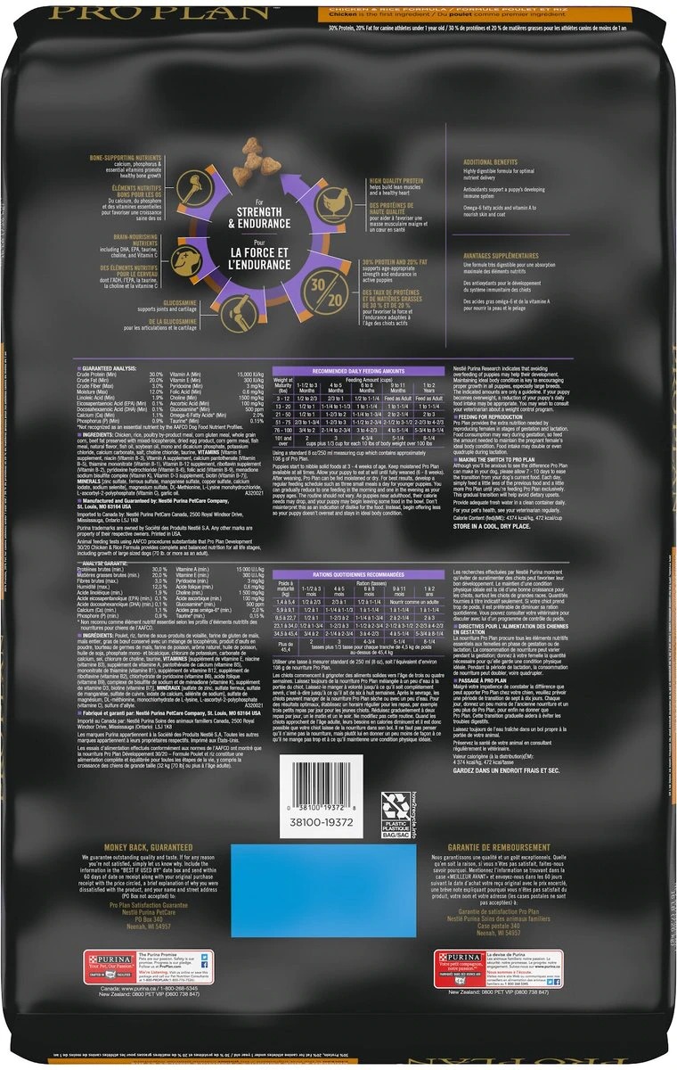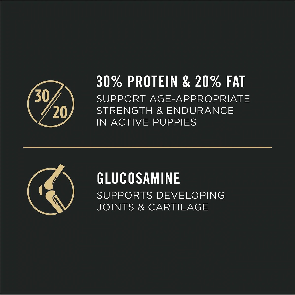 Purina high-protein dry dog food with 30% protein and 20% fat to support age-appropriate strength and endurance in active puppies.