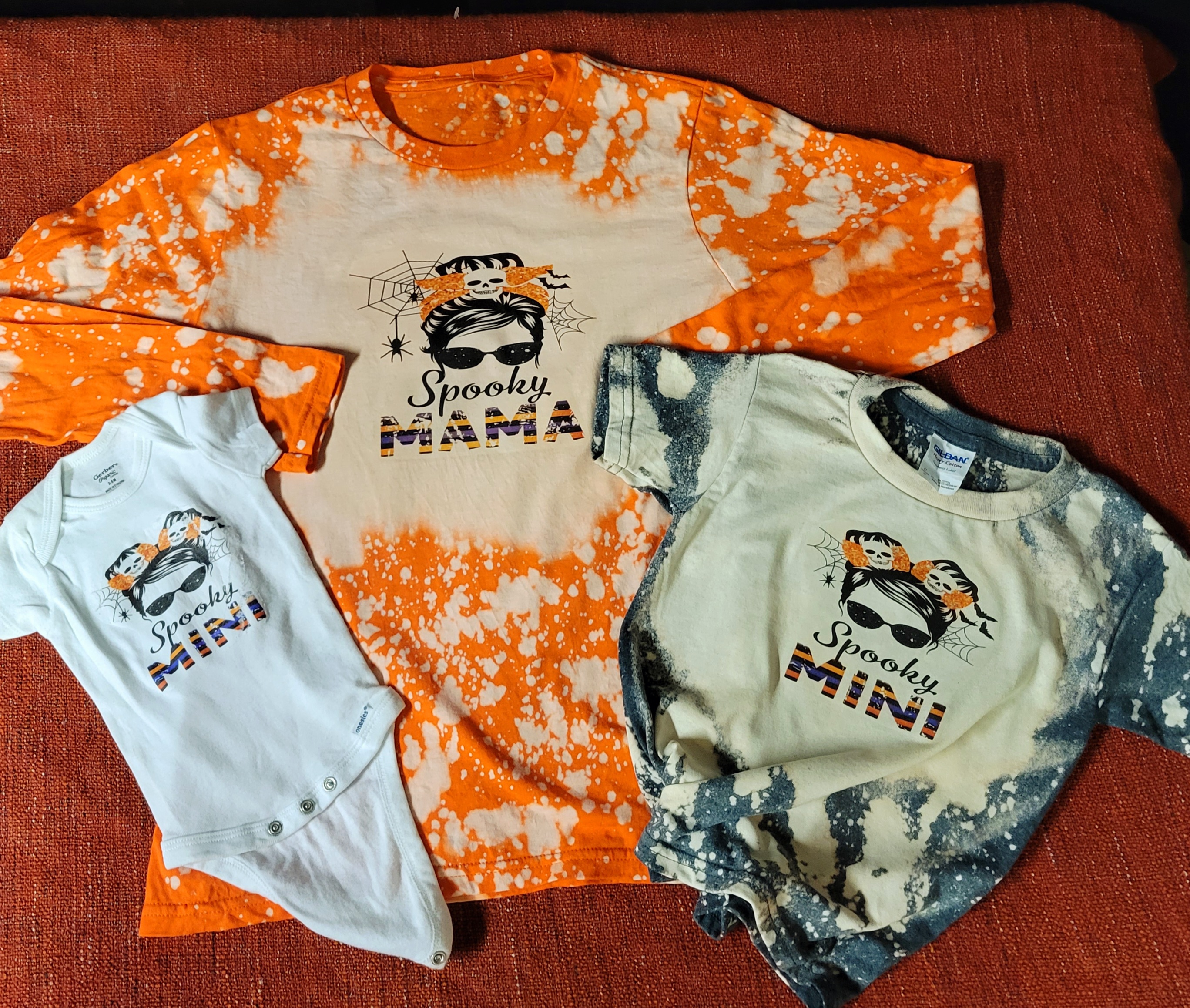 Spooky mama and mini set. There will be an option to only purchase one or the other. Sizes S-2xl for adults. Kids sizes 3-6 mo- Youth XL. Colors available are orange, white and charcoal. Picture shown for mama shirt is long sleeve, but only short sleeve will be available for this set. All shirts will be bleach washed except white.