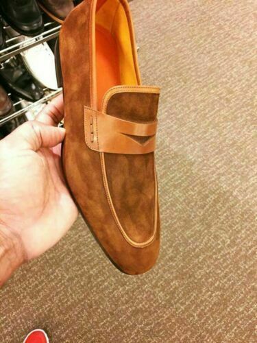 Men's Brown Leather Suede Hand Painted Penny Loafer Shoes