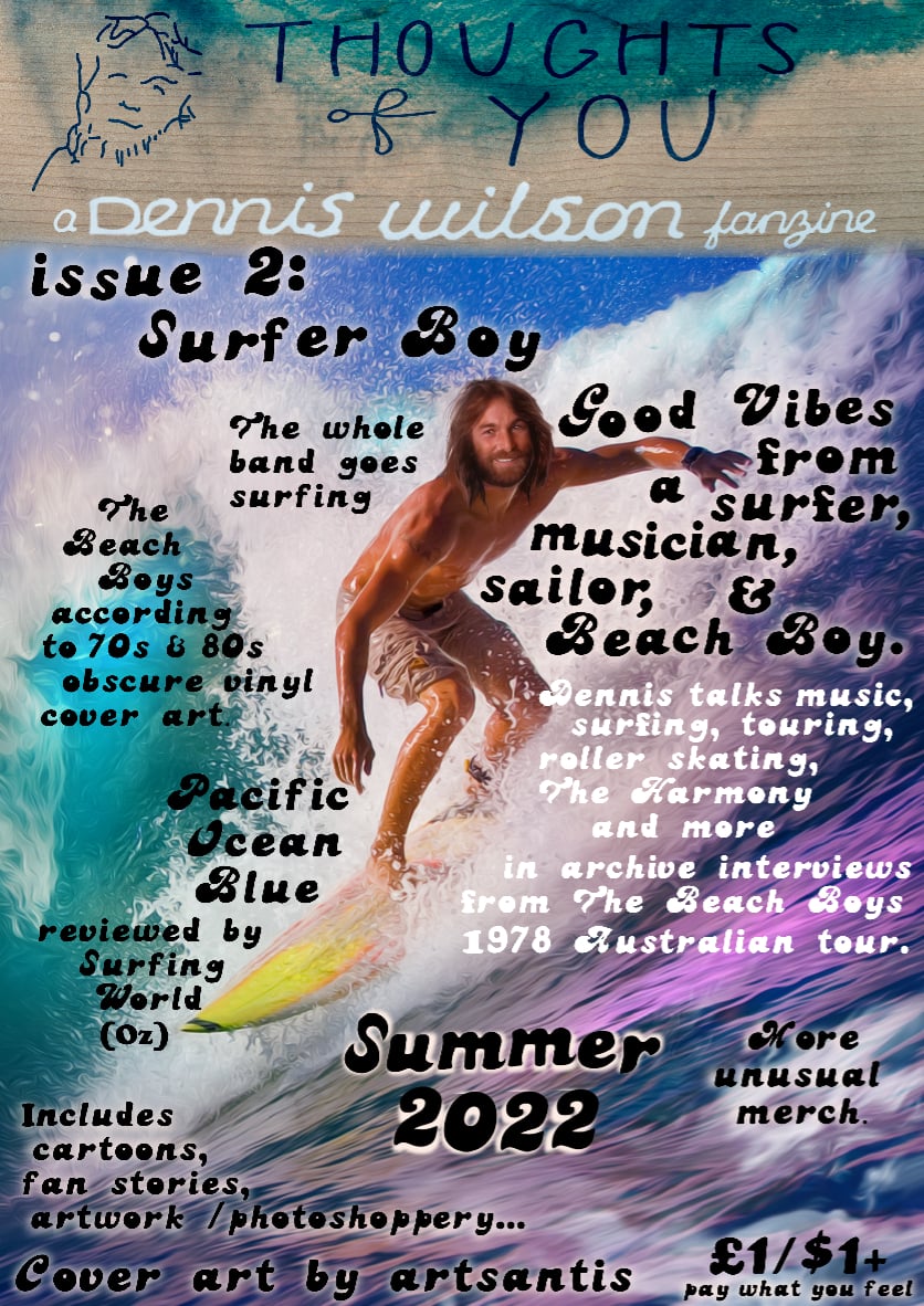 Also tributes to Billy Hinsche and Taylor Hawkins; Beach Boys/Beatles mash up art by Why The Longplay face?; a rant about a vaguely Dennis related NFT (inc. some casual swearing), fan memories of Dennis by Bengt Stenström; an archive review of Pacific Ocean Blue from Surfing World in '78; Dennis & Brian accidentally gatecrashing the BBC's Top Of The Pops coverage of Kokomo; art by PDC, Ooonthemarket333, Valerie Simadis, and Jackie Modra; cartoons by Ollivier Cartoonist (a homage to Bobby Figueroa, Dennis decides it's time Carl learns how to surf, & celebrating the Beach Boys 60th anniversary); a random anonymous Dennis confession; typographic collages inspired by Pond's Sitting Up On Our Crane; obscure vintage Beach Boys compilations with cover art portraying the whole band surfing ; Beach Boys album cover glitter art found on etsy + other odd merch, screen shots of Dennis as the original true surfer of the band...