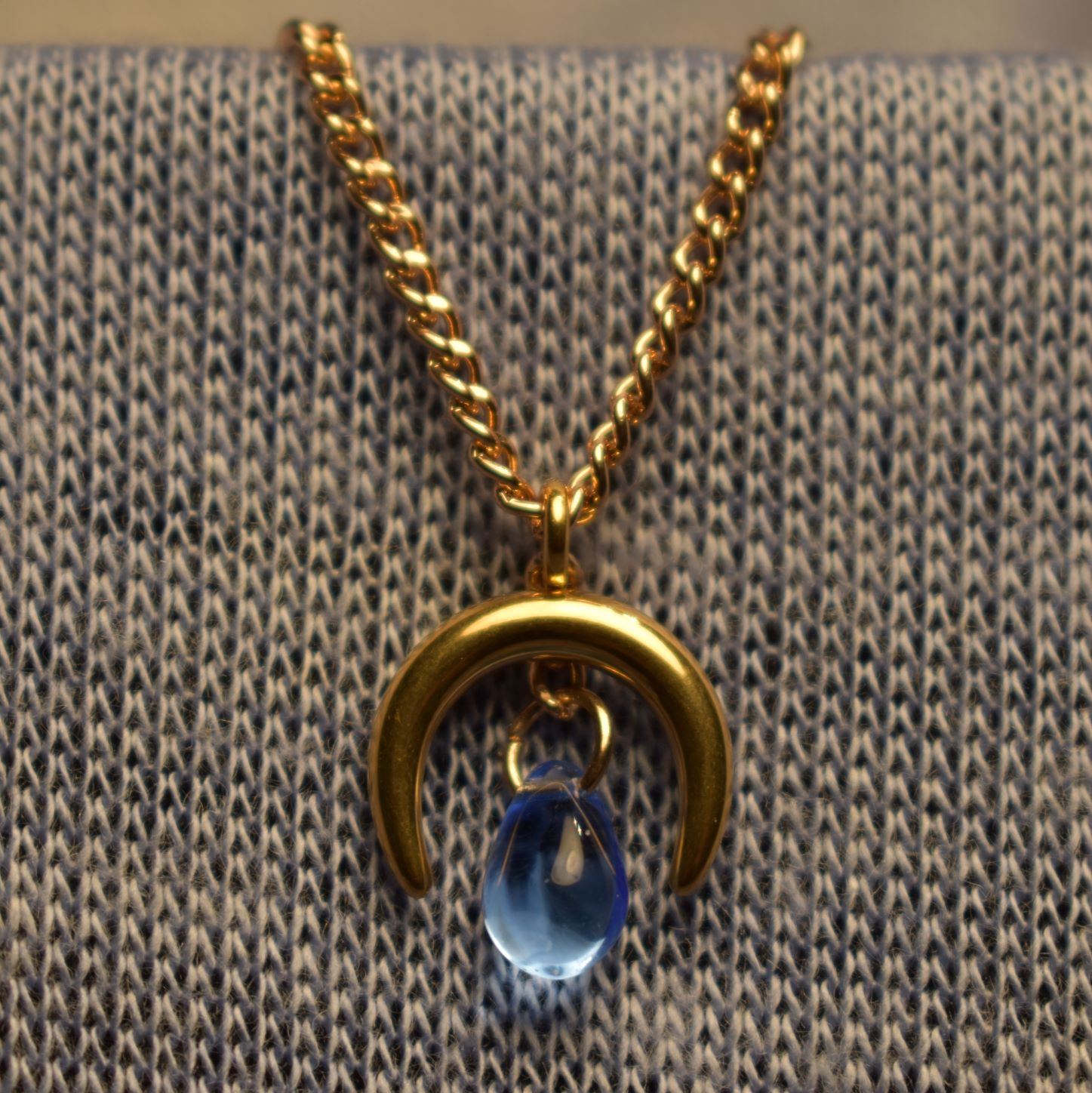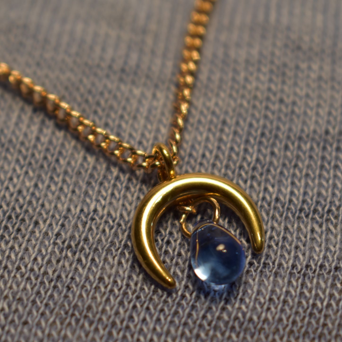 Gold crescent shape necklace with blue stone Length: 15"-17" (38cm-43cm) adjustable chain All products handled with sanitized gloves