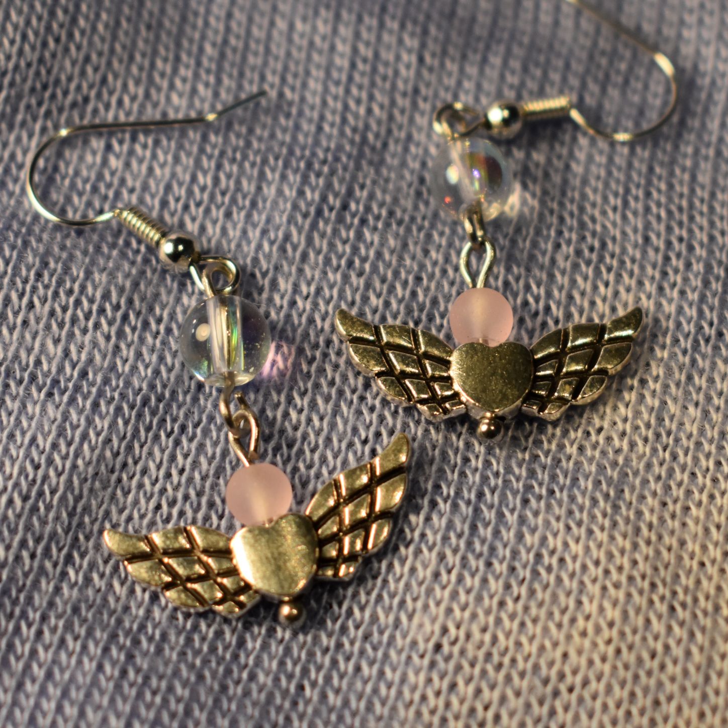 Available as clip-ons in the dropdown menu. Silver angel wings with heart and pink beads - hypoallergenic and handmade Length: 1" (2.5cm), not including hook in measurement All products handled with sanitized gloves