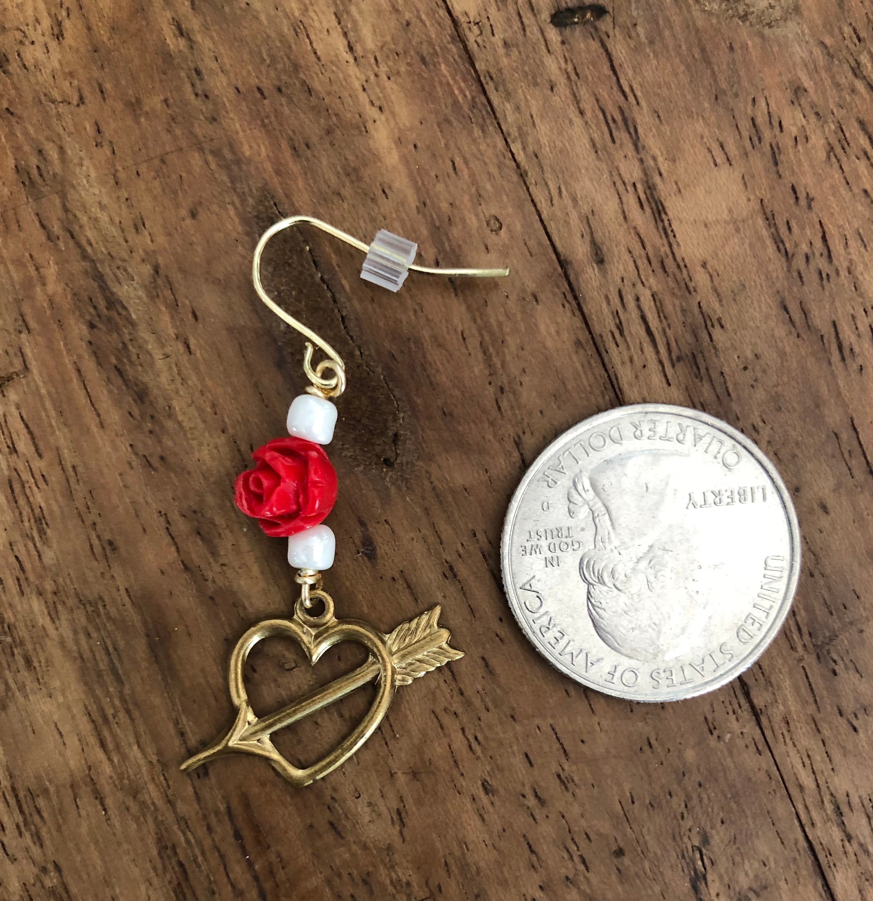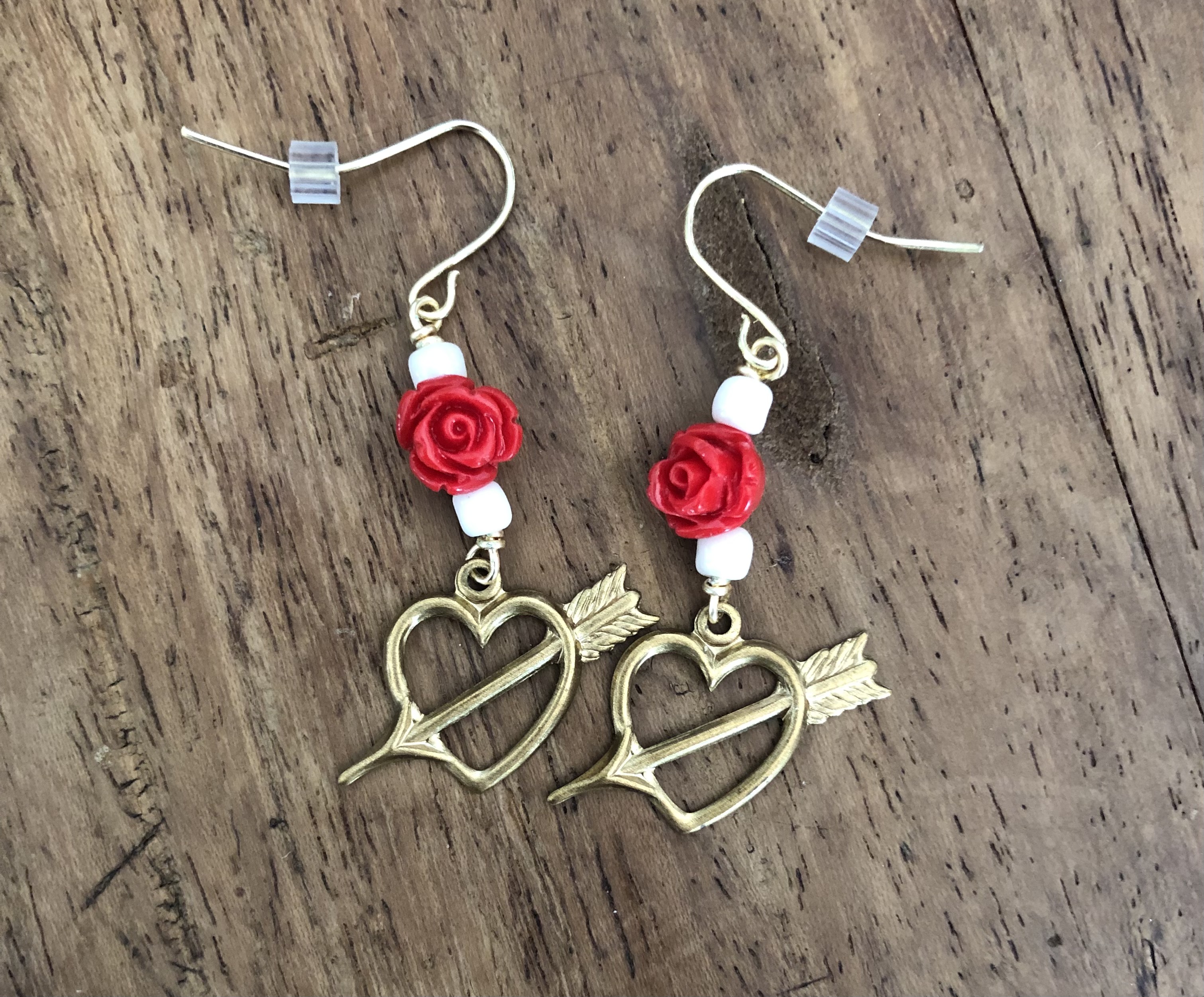 Small arrows through hearts golden colored charms wire wrapped underneath tiny white beads and small red rose beads