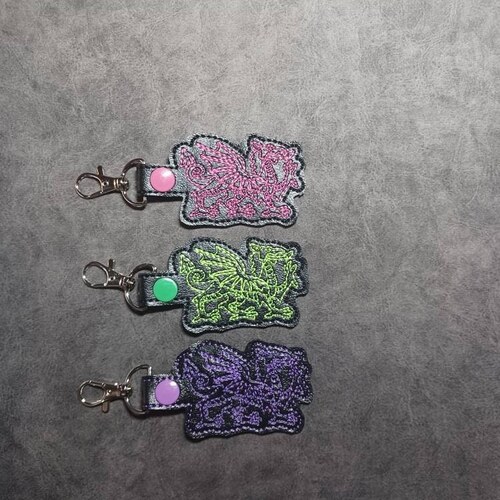 Dragon keychains embroidered on vinyl. If you want a specific color, please let me know.
