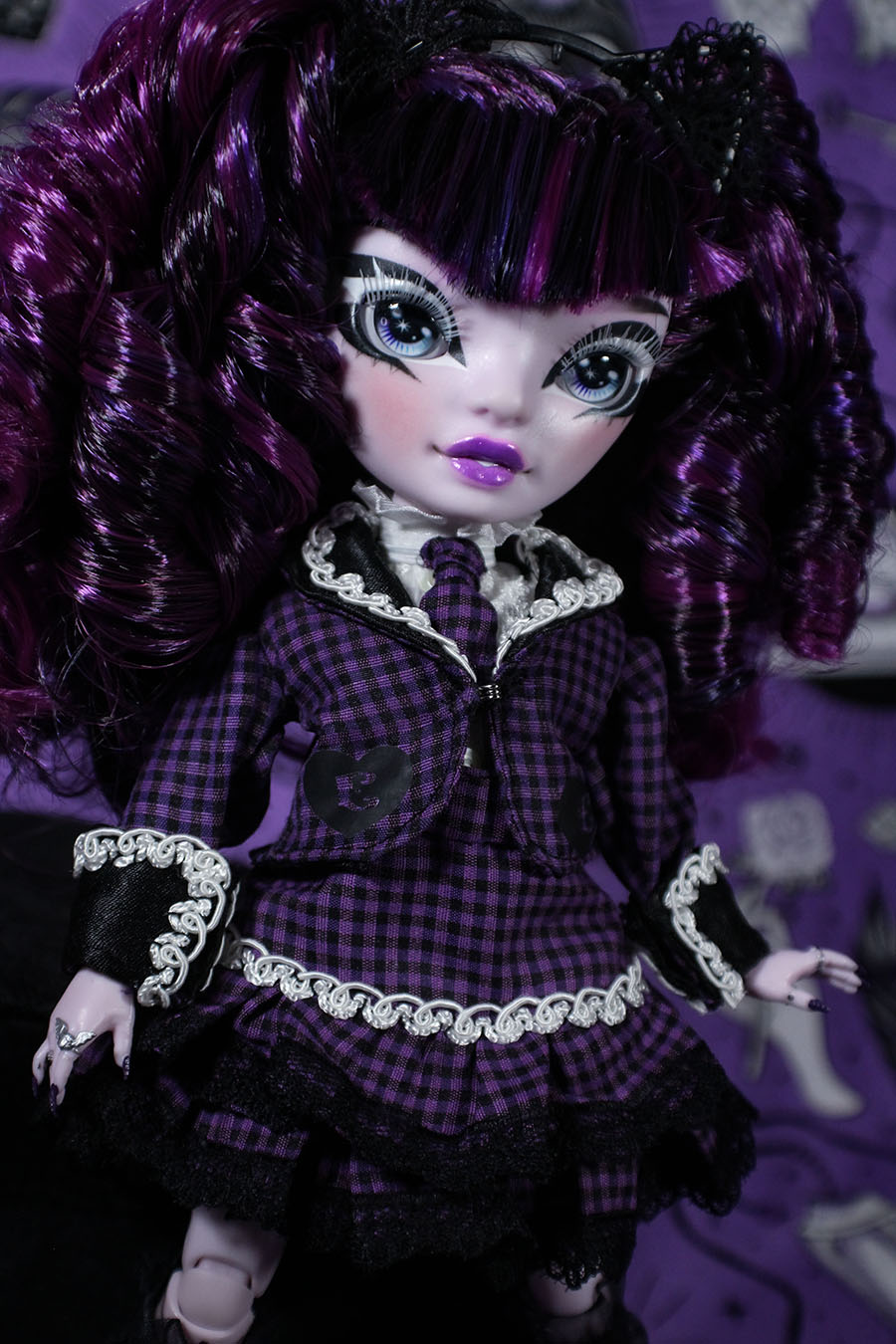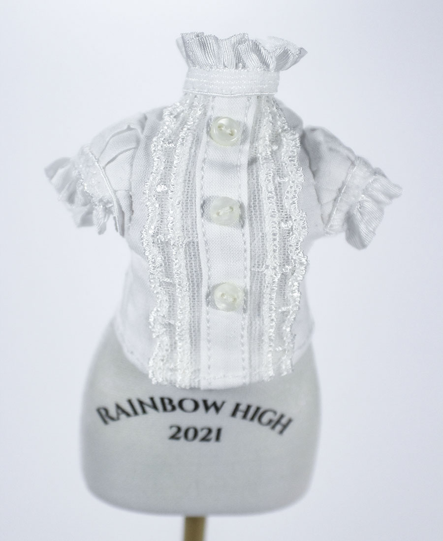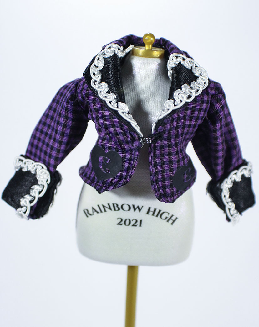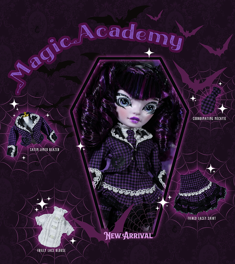 A coordinate ideal for the cute new student who just transferred to our most prestigious witch school! She's a little mysterious, a little mischievous, but always fashionable in this old school egl inspired outfit. Fit for Rainbow High, Monster High, Pullip, Blythe and other similarly sized dolls. • Satin lined blazer with white trim and vinyl heart details • Frilly short sleeved blouse with buttons • Coordinating necktie • Tiered skirt trimmed in black lace Doll and other accessories pictured are not included.