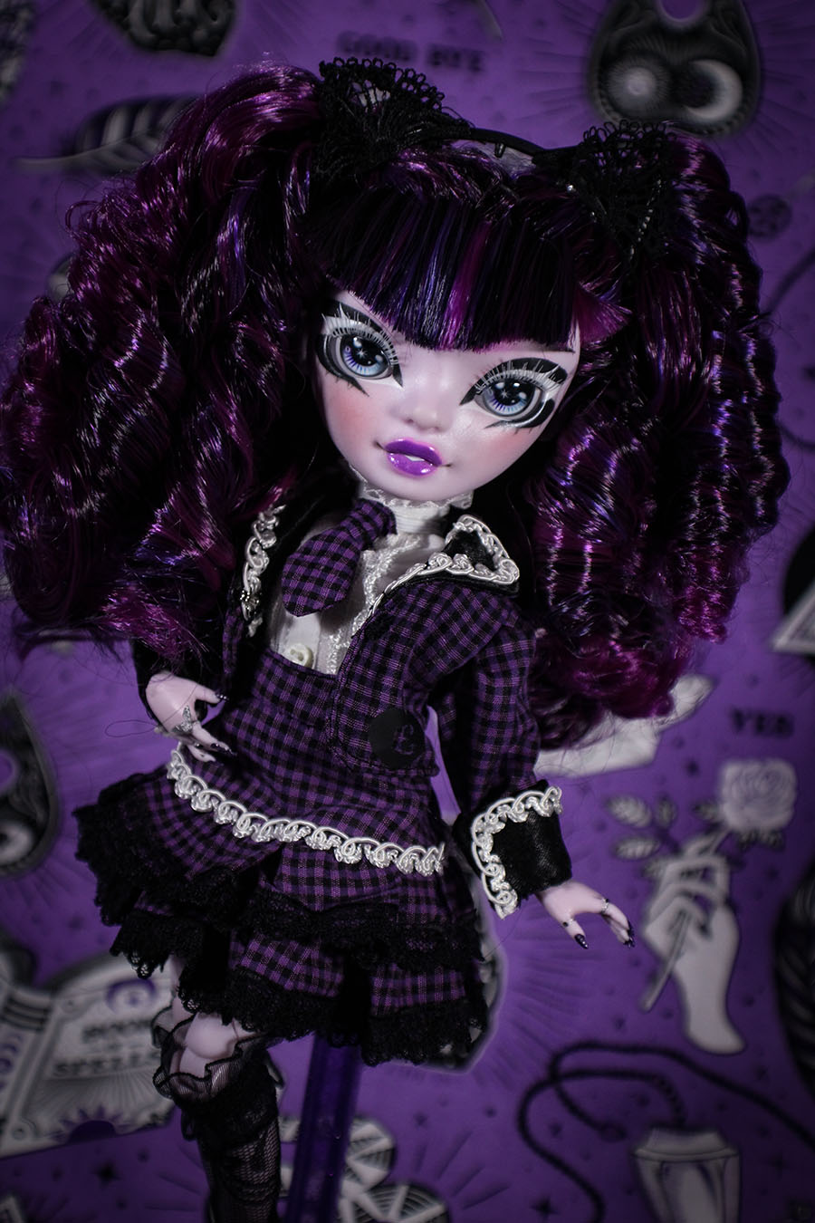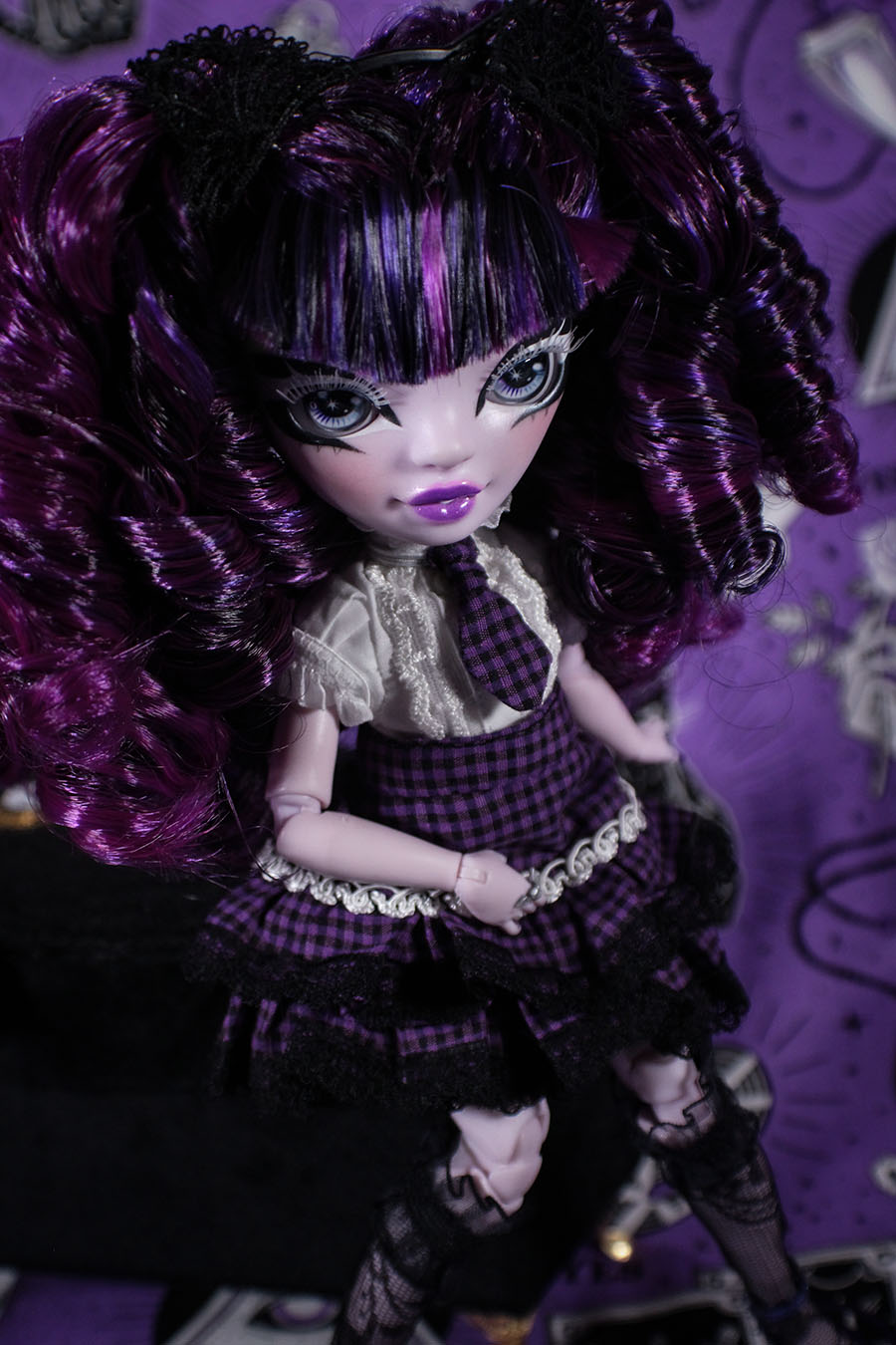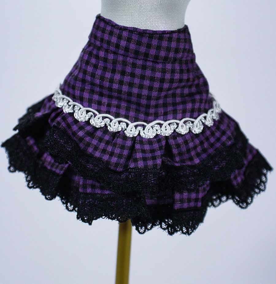 A coordinate ideal for the cute new student who just transferred to our most prestigious witch school! She's a little mysterious, a little mischievous, but always fashionable in this old school egl inspired outfit. Fit for Rainbow High, Monster High, Pullip, Blythe and other similarly sized dolls. • Satin lined blazer with white trim and vinyl heart details • Frilly short sleeved blouse with buttons • Coordinating necktie • Tiered skirt trimmed in black lace Doll and other accessories pictured are not included.
