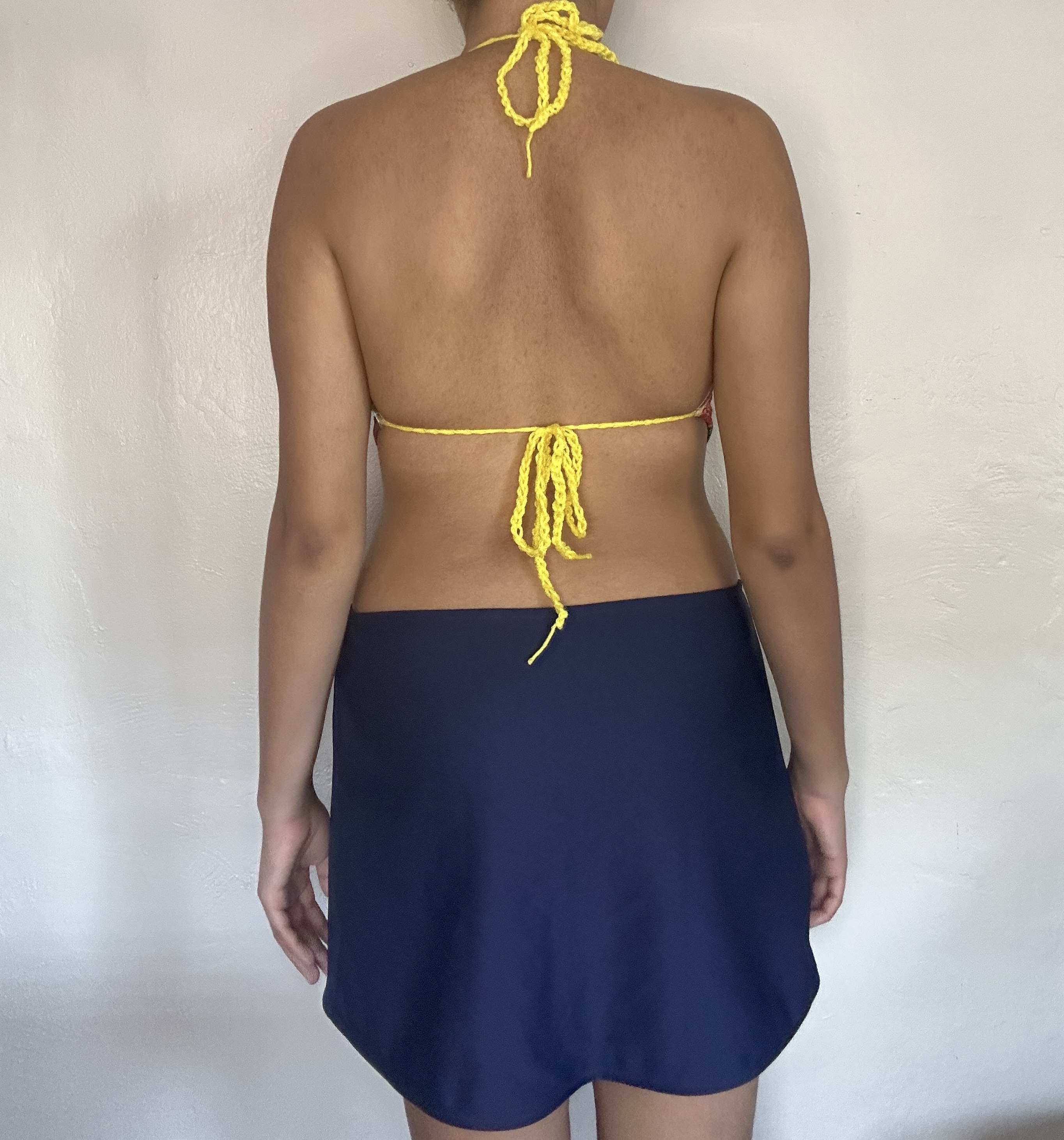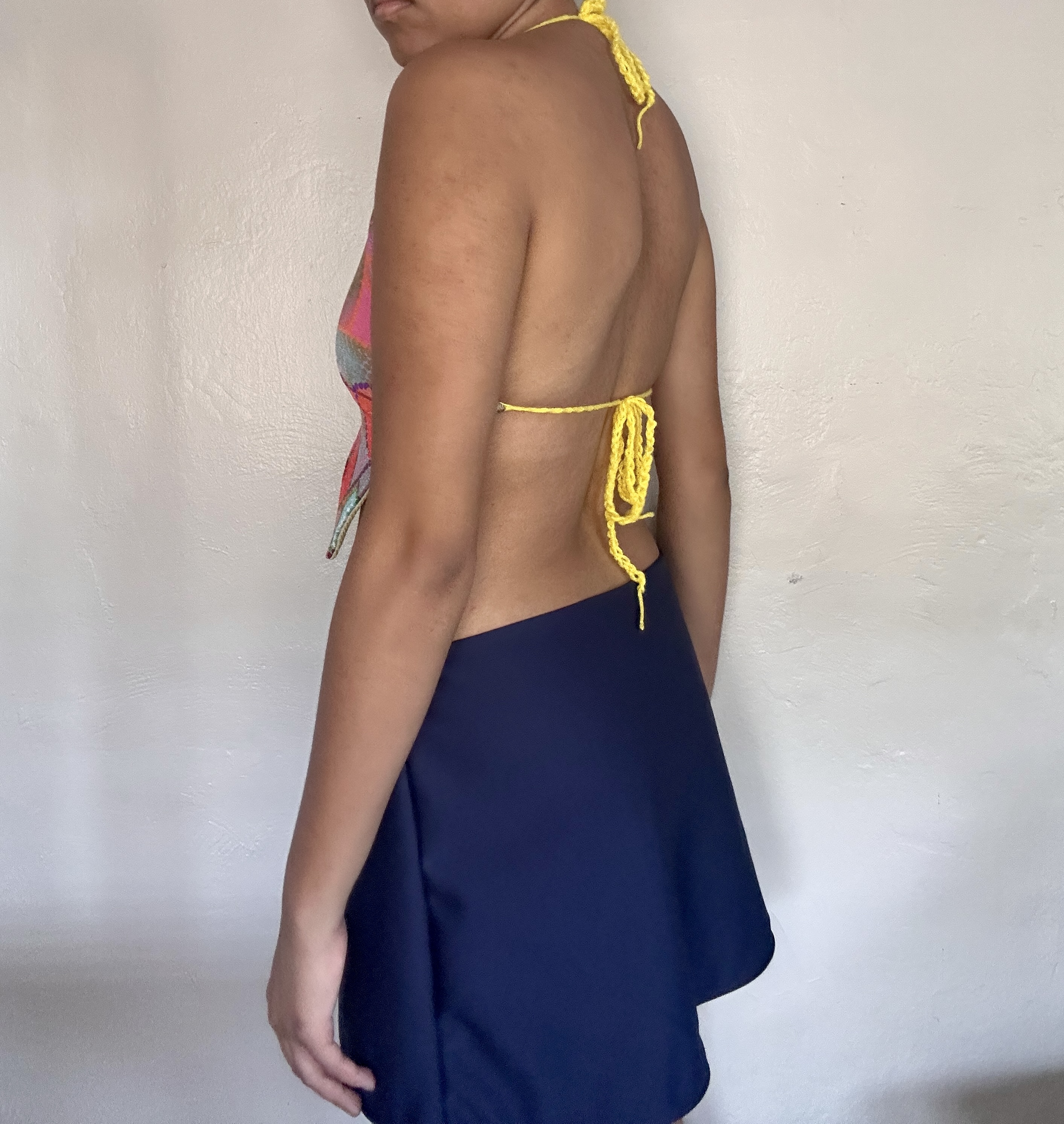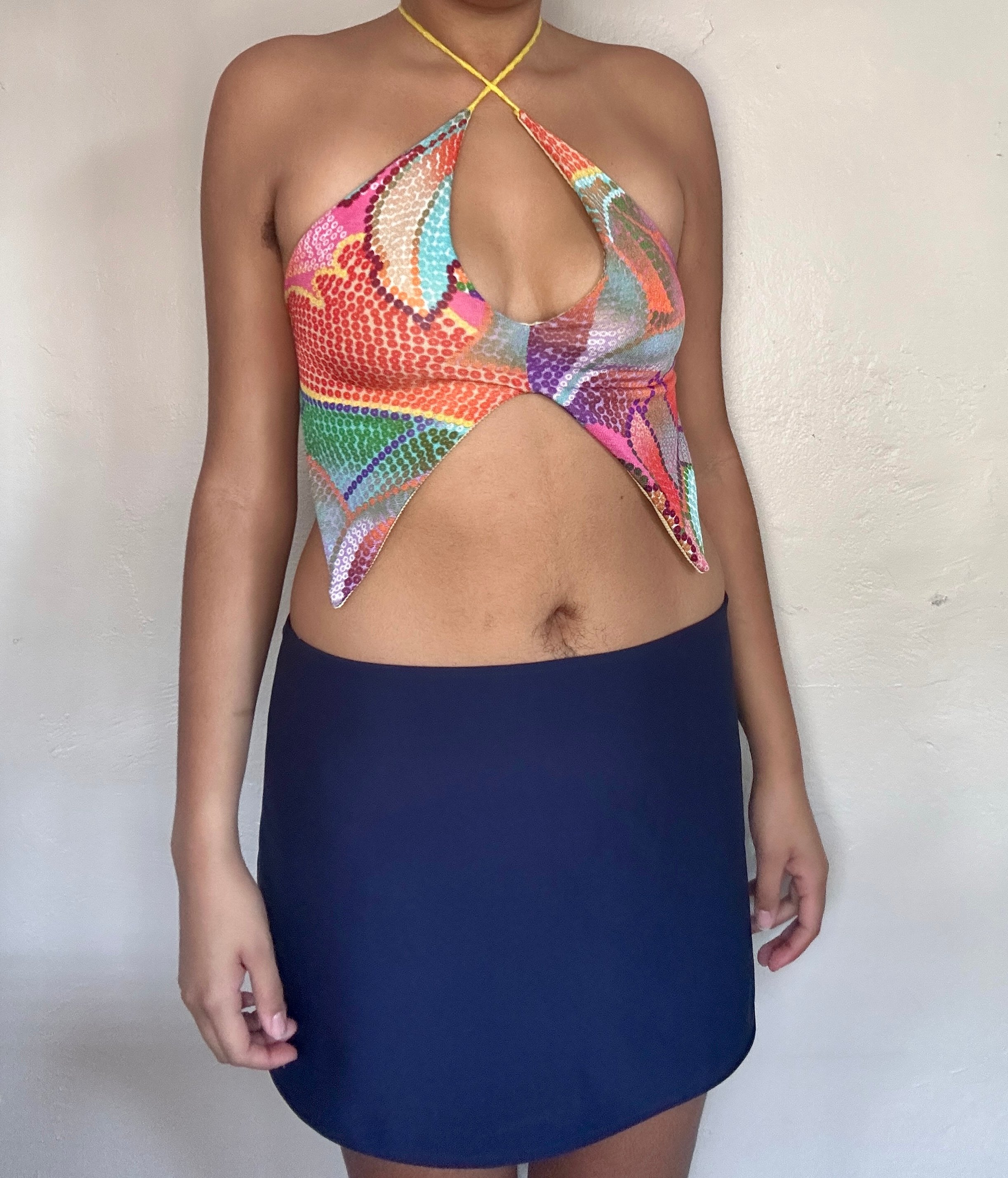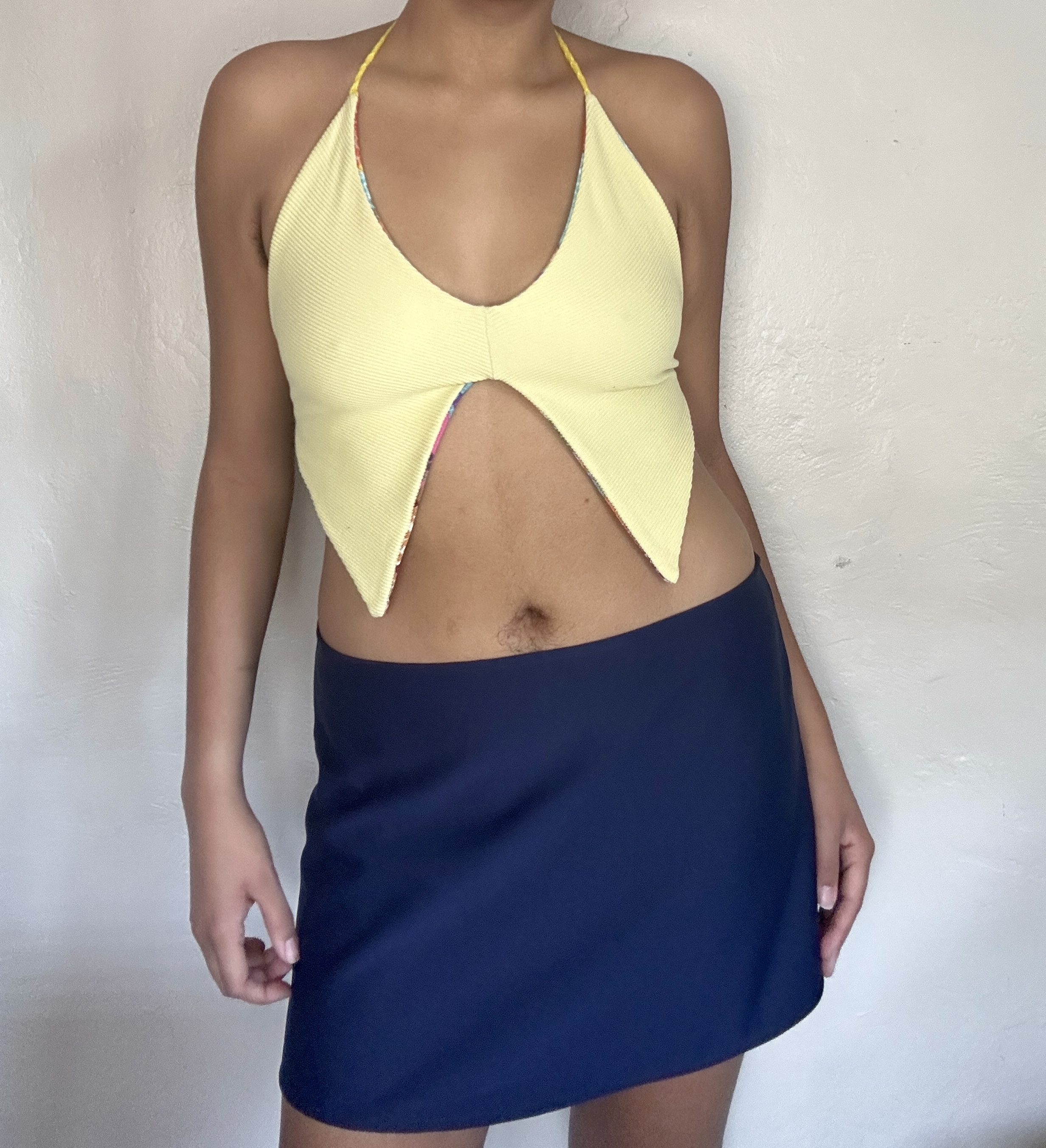 Cup Size A - D. Double sided with a ribbed Yellow side and a psychedelic colorful pattern on the other side. The ties can be tied in a variety of ways for different outfits. The diamond top is made to fit many sizes with its adjustable ties. It is sized by bra cup and handmade with all reused materials.