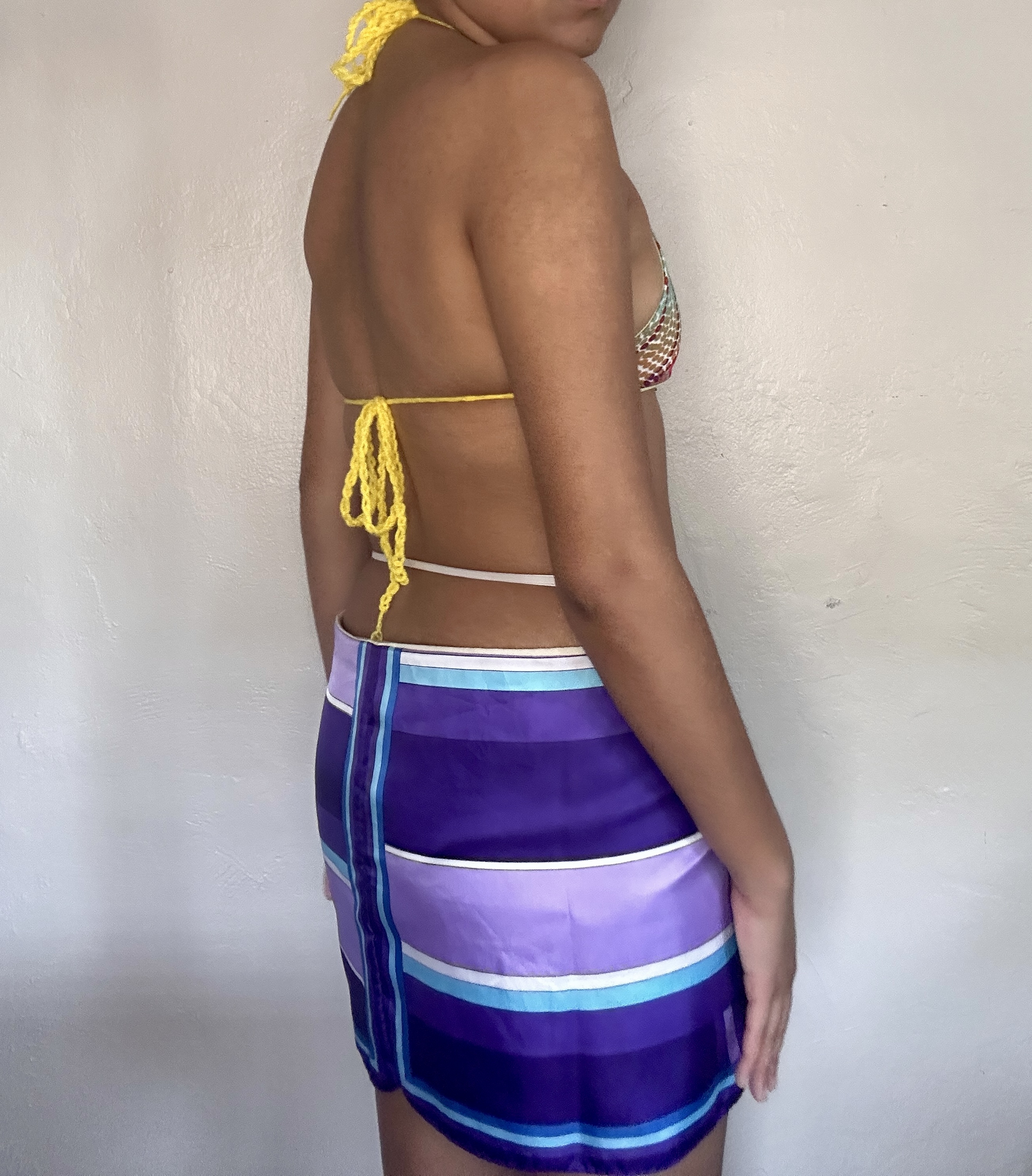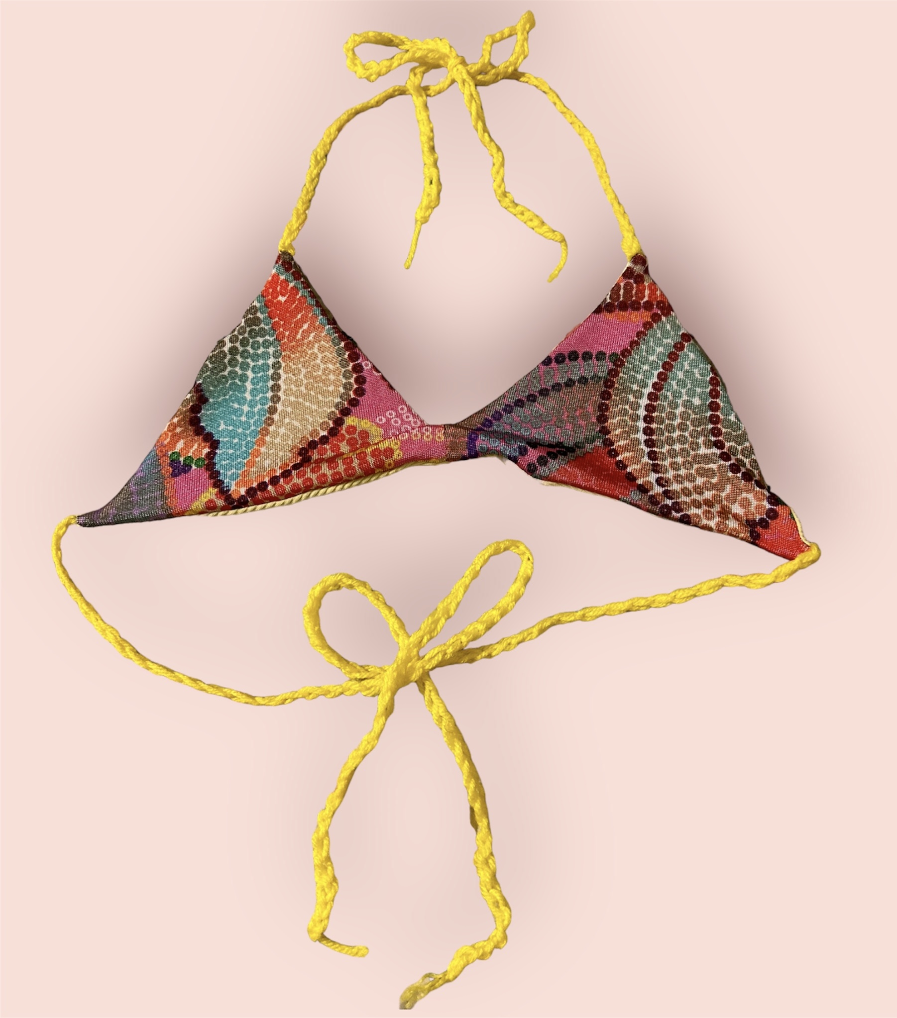 Cups size AA - B. These bikini tops are made by all reused materials. The ties in the back allow them to fit many body sizes. They are double sided for double the use! One side is a stretchy ribbed yellow fabric and the other is a stretchy colorful psychedelic pattern. They tie around the body in a variety of ways with yellow crochet ties.