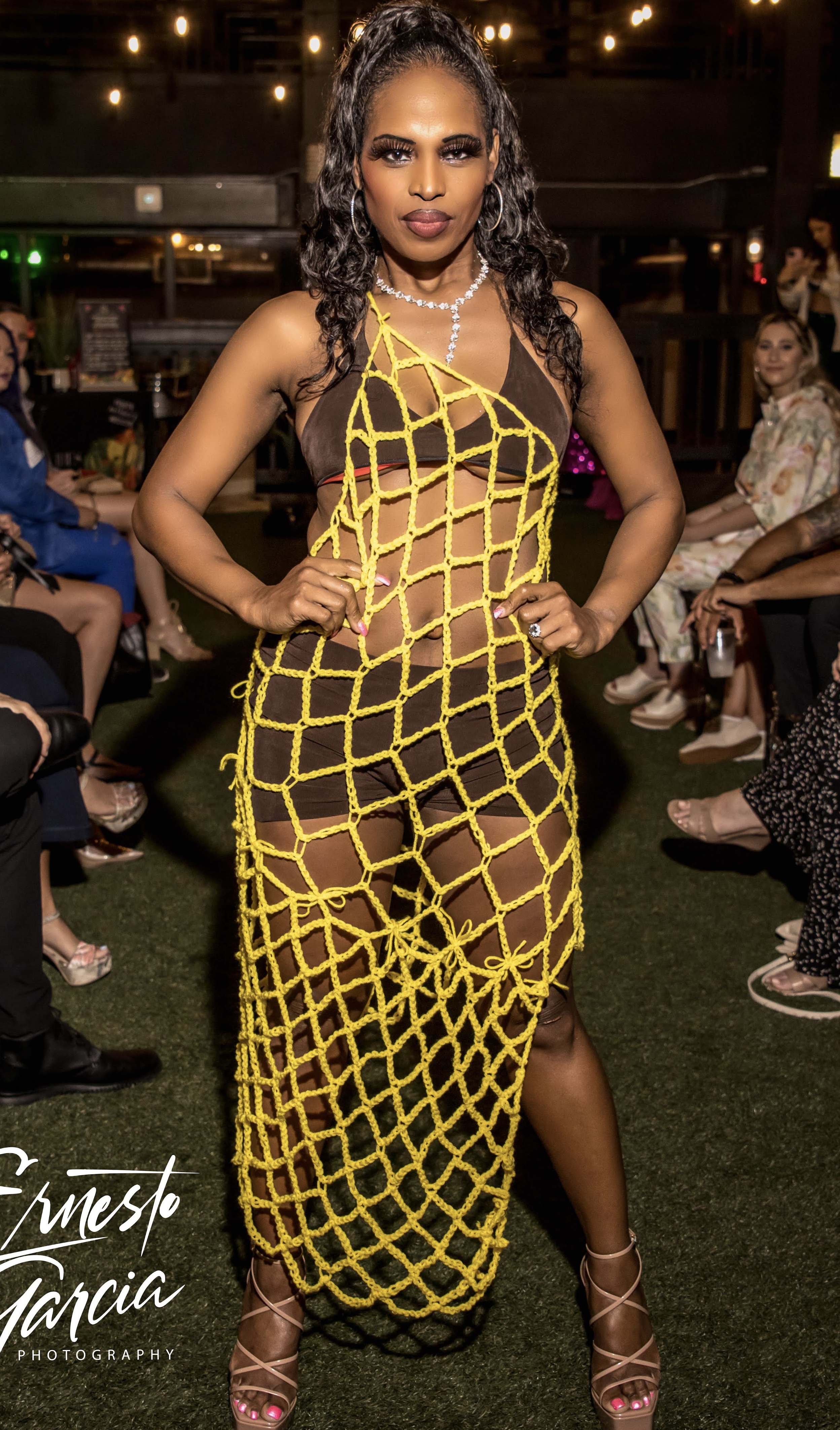 Size XS - L. Made of a yellow stretchy crochet link. It is handmade by all reused materials. Open back with bows scooping to the front. They go perfectly with our double sides bikini and mini skirt for pool parties and beach outings!