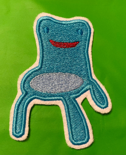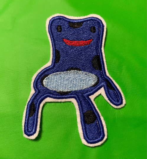 Embroidered on green(for green chairs) or white(for all other chairs) felt with iron-on transfer on the back(for quality froggy chair, not defectives), but I recommend stitching it down.