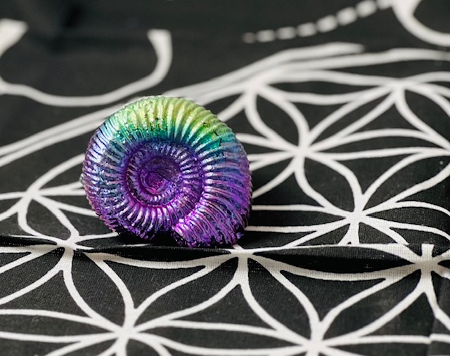 A sculpture based on ammonite fossils. This piece is made of bismuth - element 83 on the periodic table. It is not painted. This coloration is the natural result of the oxidization of the metal. The sculpture was hand forged by artisans at The Bismuth Smith. The Crystal Crow is an approved distributor of The Bismuth Smith products.