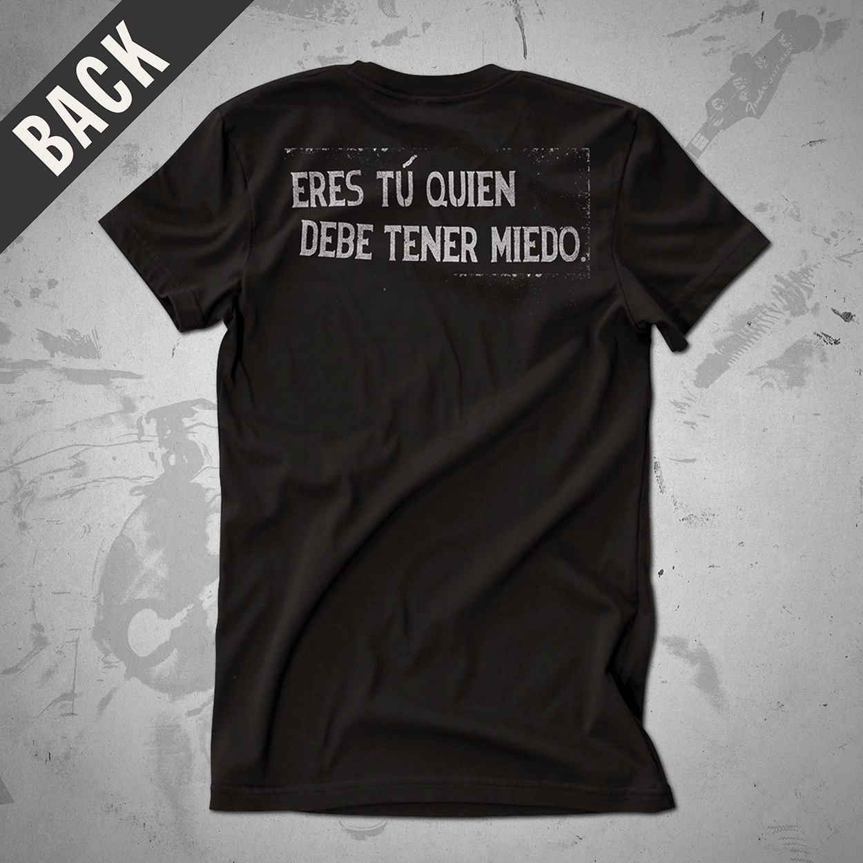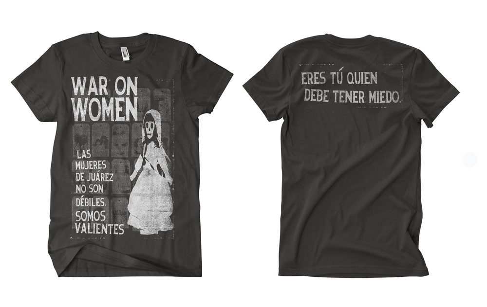 "We are not weak, we are brave. It's you who should be afraid" A shirt in honor of all the women who have been taken and are missing in Juarez, Mexico. Lyrics from our song "Diana la Cazadora." White ink on black shirt.